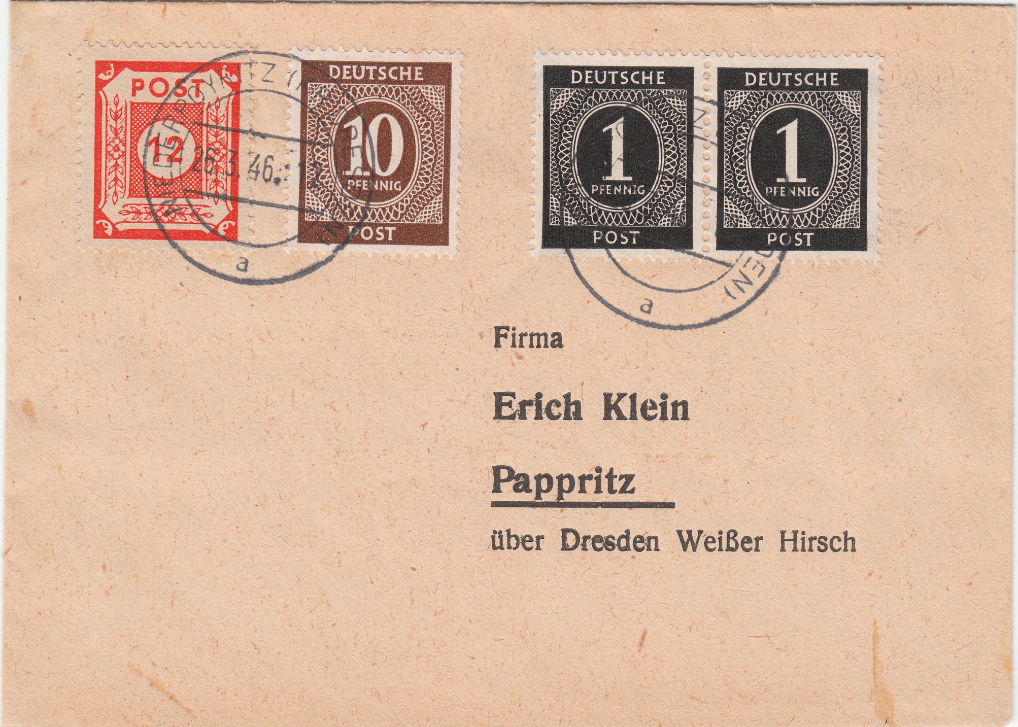 Paar der MiNr. 911 in Mischfrankatur mit einer MiNr. 918 sowie einer Ausgabe Sowjetische Zone - Ostsachsen MiNr. 63 v am 26.03.1946 als erstem Monat der Gültigkeit dieser Portostufe portorichtig auf Fernbrief (24 Pf) von NIEDERPOYRITZ nach Pappritz: