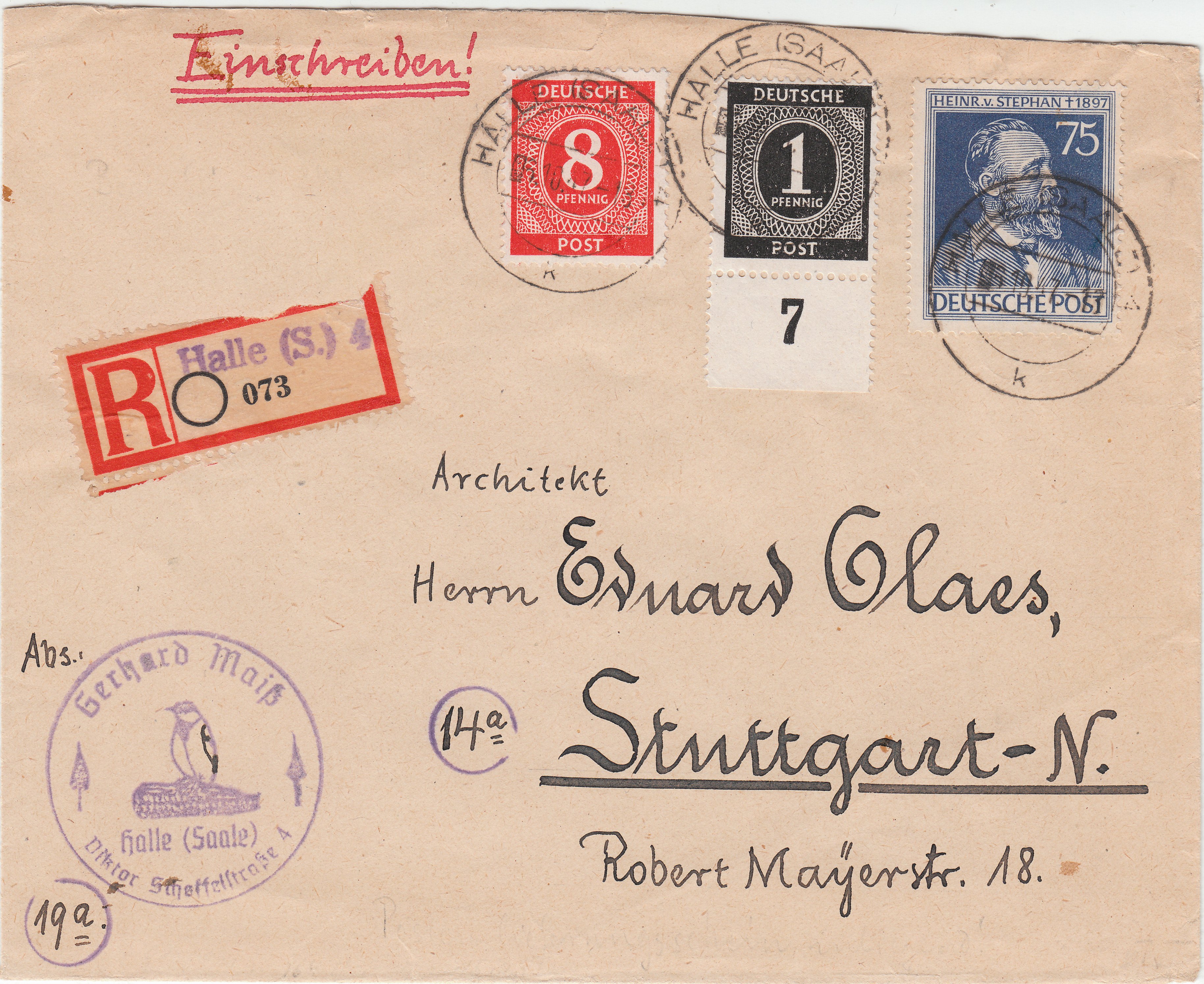 MiNr. 911 vom Unterrand mit Reihenzähler "7", also Feld 97, am 06.10.1947 in portorichtiger Mischfrankatur mit einem 8 Pf Wert der Ziffernserie sowie einem 75 Pf Wert Stephan auf Fernbrief (24 Pf) per Einschreiben (60 Pf):