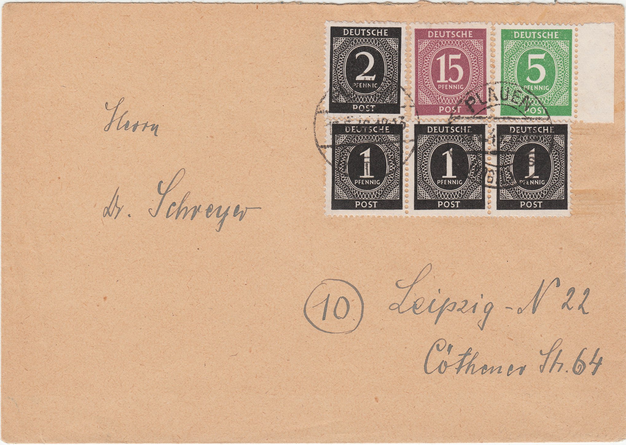 Dieses Exemplar wurde auf einem Brief im Fernverkehr (24 Pf) per Einschreiben (60 Pf) in Kombination mit einem 8 Pf Wert der Ziffernserie sowie einer zur Leipziger Messe 1947 erschienenen Sondermarke als portogerechte Mischfrankatur verklebt: