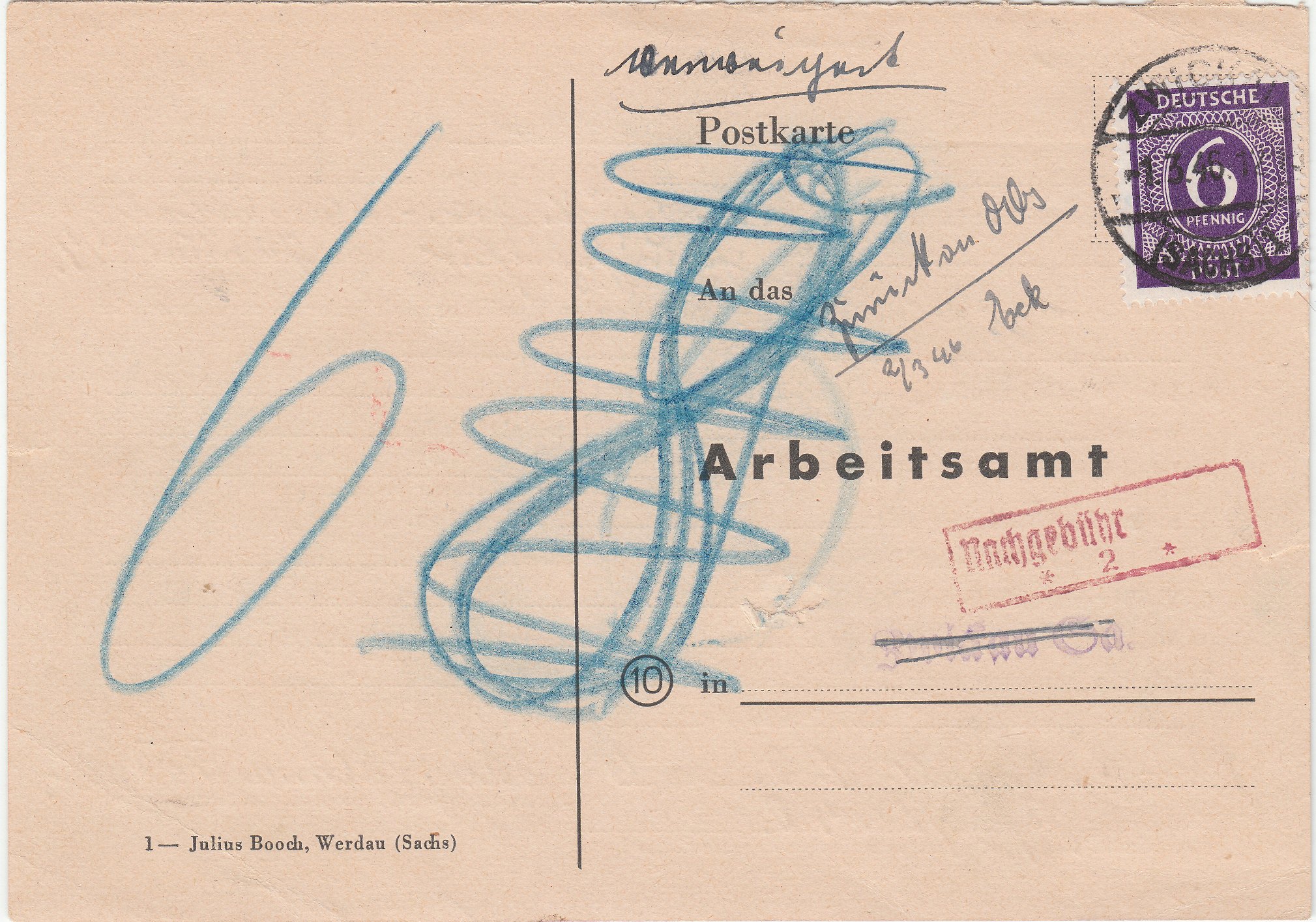 Der Empfänger, das Arbeitsamt in Zwickau, verweigerte die Annahme und der Beleg ging am 02.03.1946 zurück an den Absender, der nunmehr die Nachgebühr bezahlen mußte, worauf ein Stempel "Nachgebühr 2" in Rot hinweist. Dieser Nachgebührstempel kann somit eindeutig Zwickau zugeordnet werden!