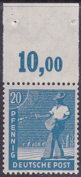 Die Marke zu 20 Pfennig wurde nur im Plattendruck hergestellt. Hier zeige ich eine Marke mit nicht durchgezähntem Oberrand.
