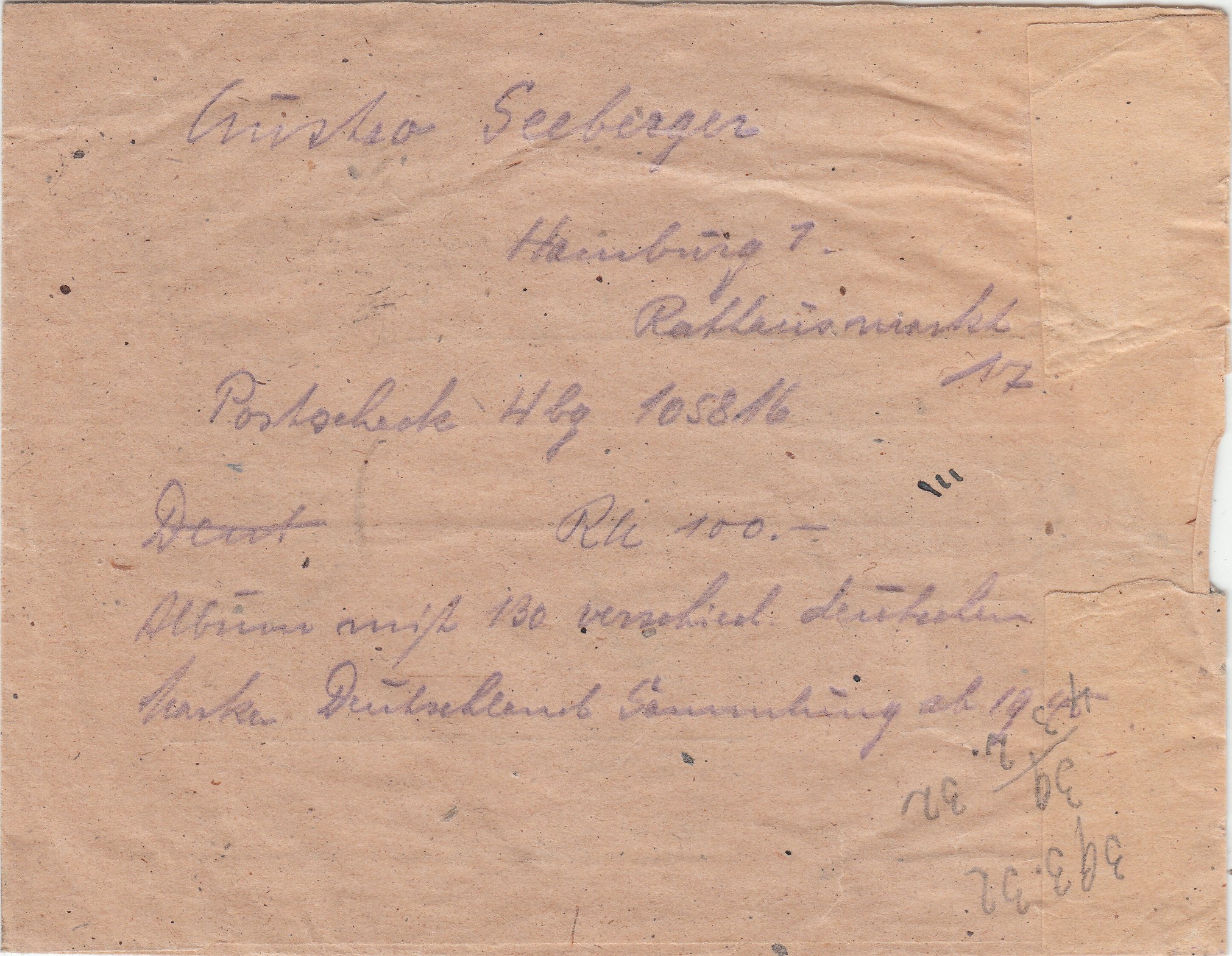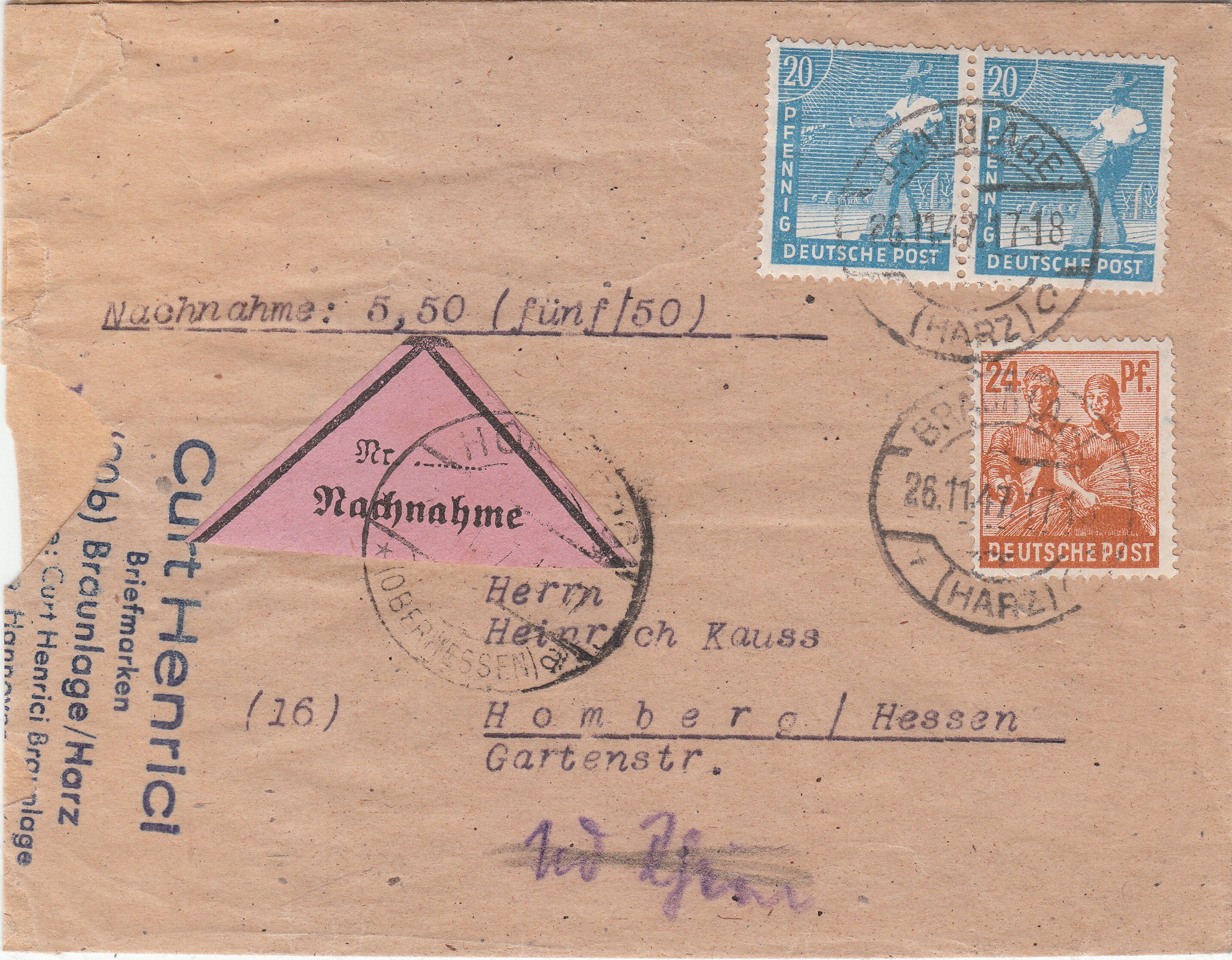 Paar der MiNr. 950 zur Abdeckung der Nachnahmegebühr (40 Pf) auf einem Fernbrief (24 Pf) am 26.11.1947: