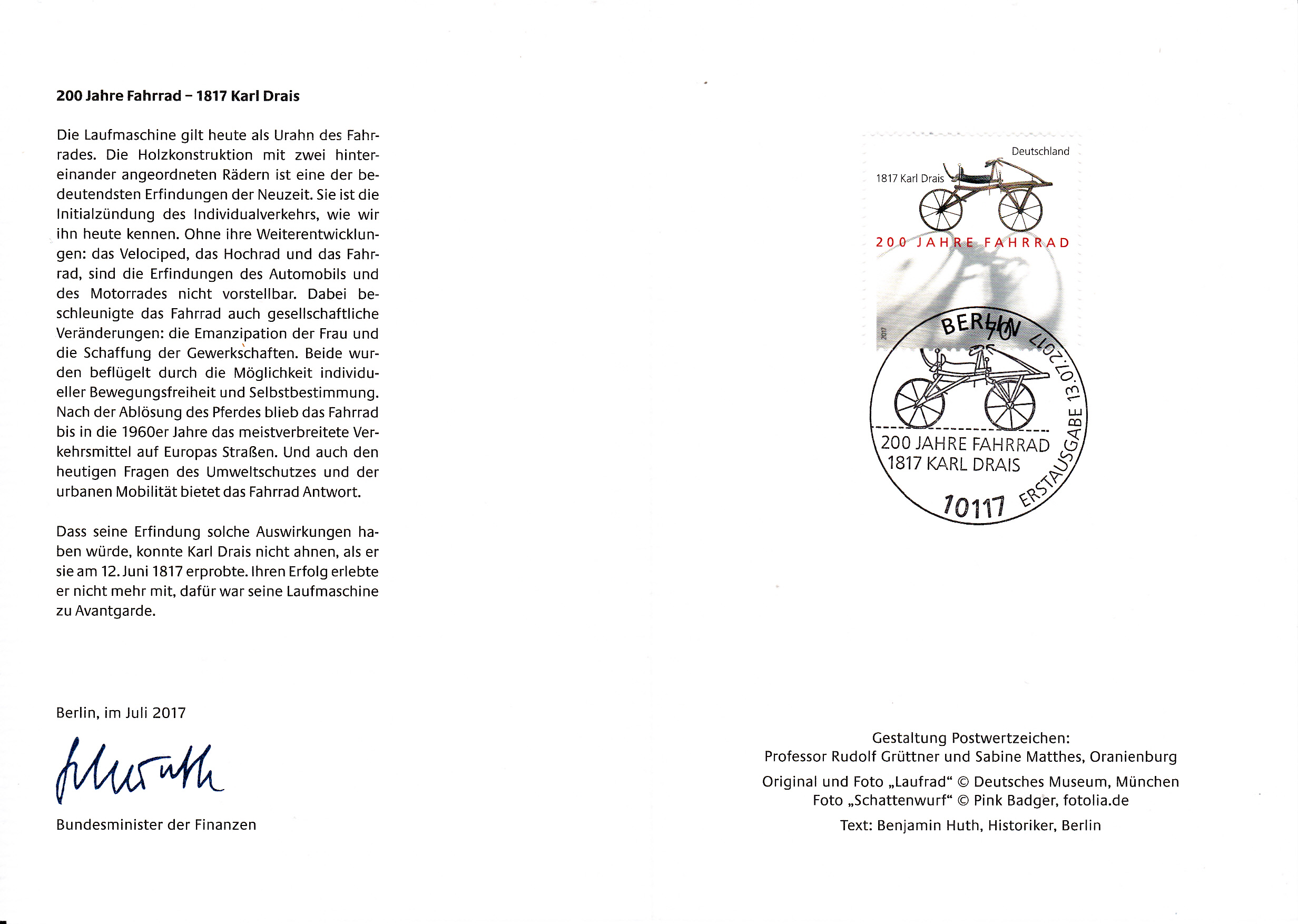 Zum Jubiläum "200 Jahre Fahrrad" erschien bei der Deutschen Post ein Marke (MiNr 3320), die eine Draisine, ein Laufrad von Karl Freiherr von Drais zeigt. Hier ein Eckstandstück der Marke mit EAN-Code.
