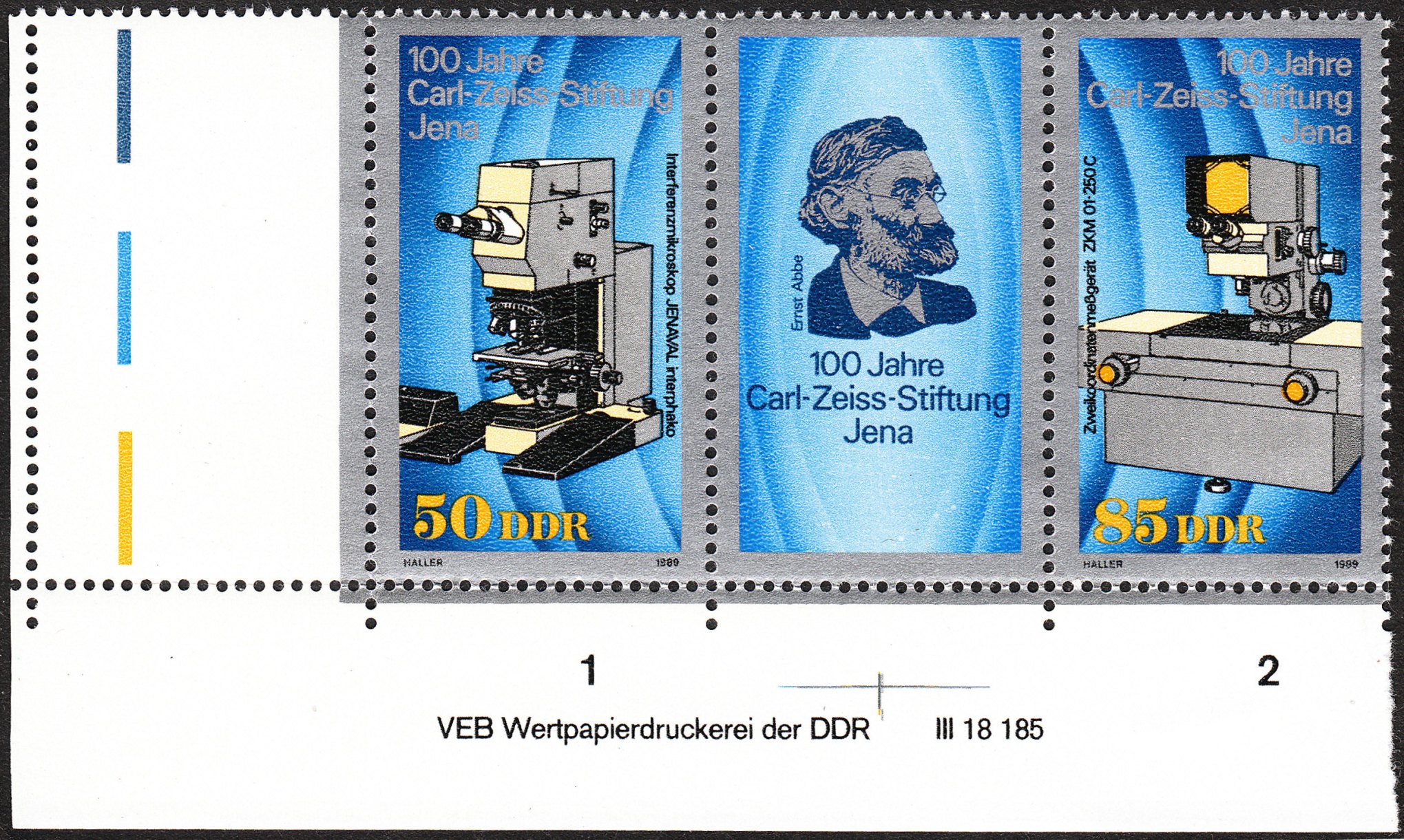 Dieser am 16.05.1989 zum Thema "100 Jahre Carl-Zeiss-Stiftung Jena" erschienene Zusammendruck der DDR erschien in einer Auflage von 3 000 000 Stück: