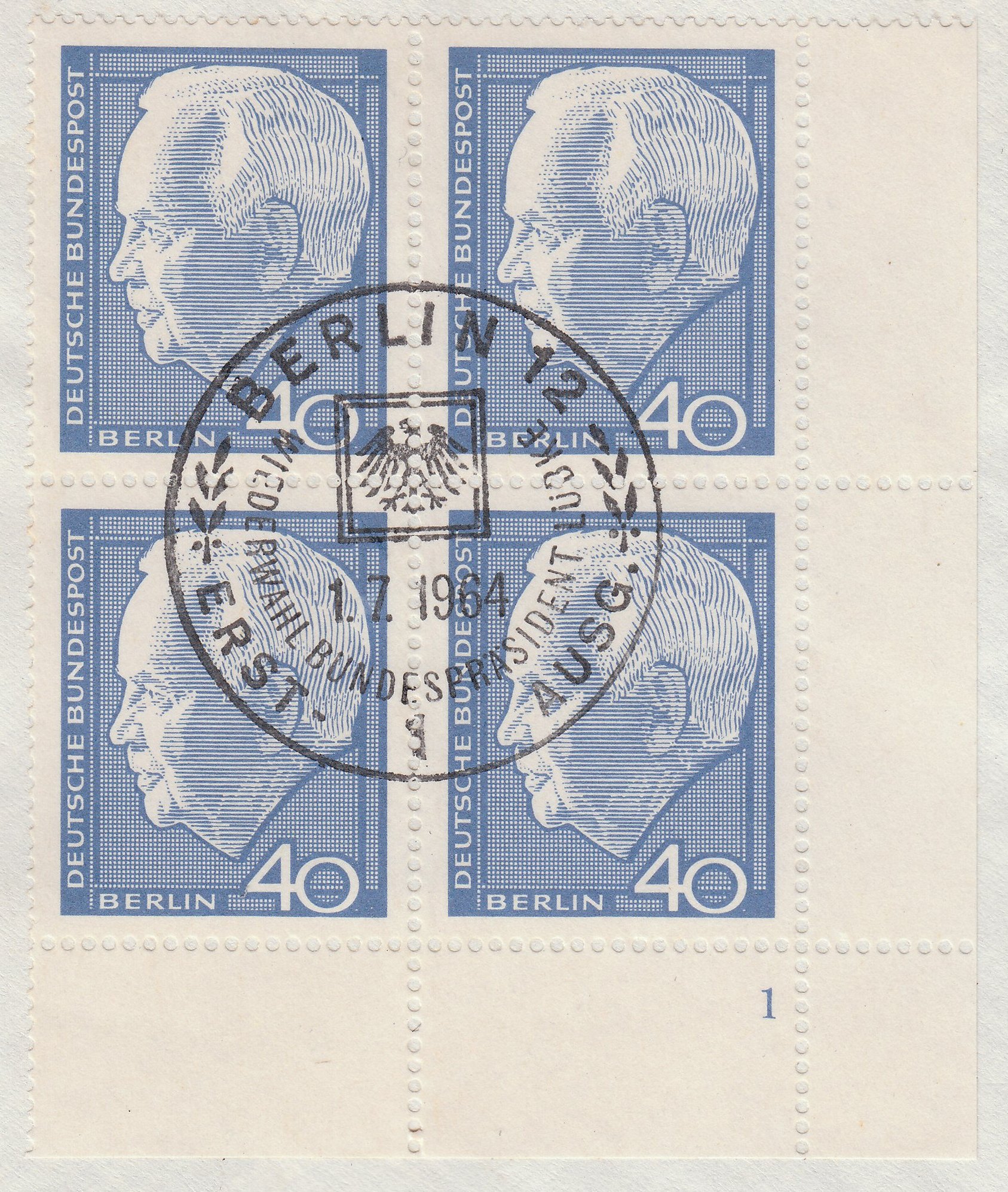 Fangen wir an mit diesem Viererblock der Wertstufe 40 Pf, MiNr. 430, vom Eckrand 4, mit Formnummer "1", auf Briefstück, mit ESST BERLIN 12 vom 01.07.1964:
