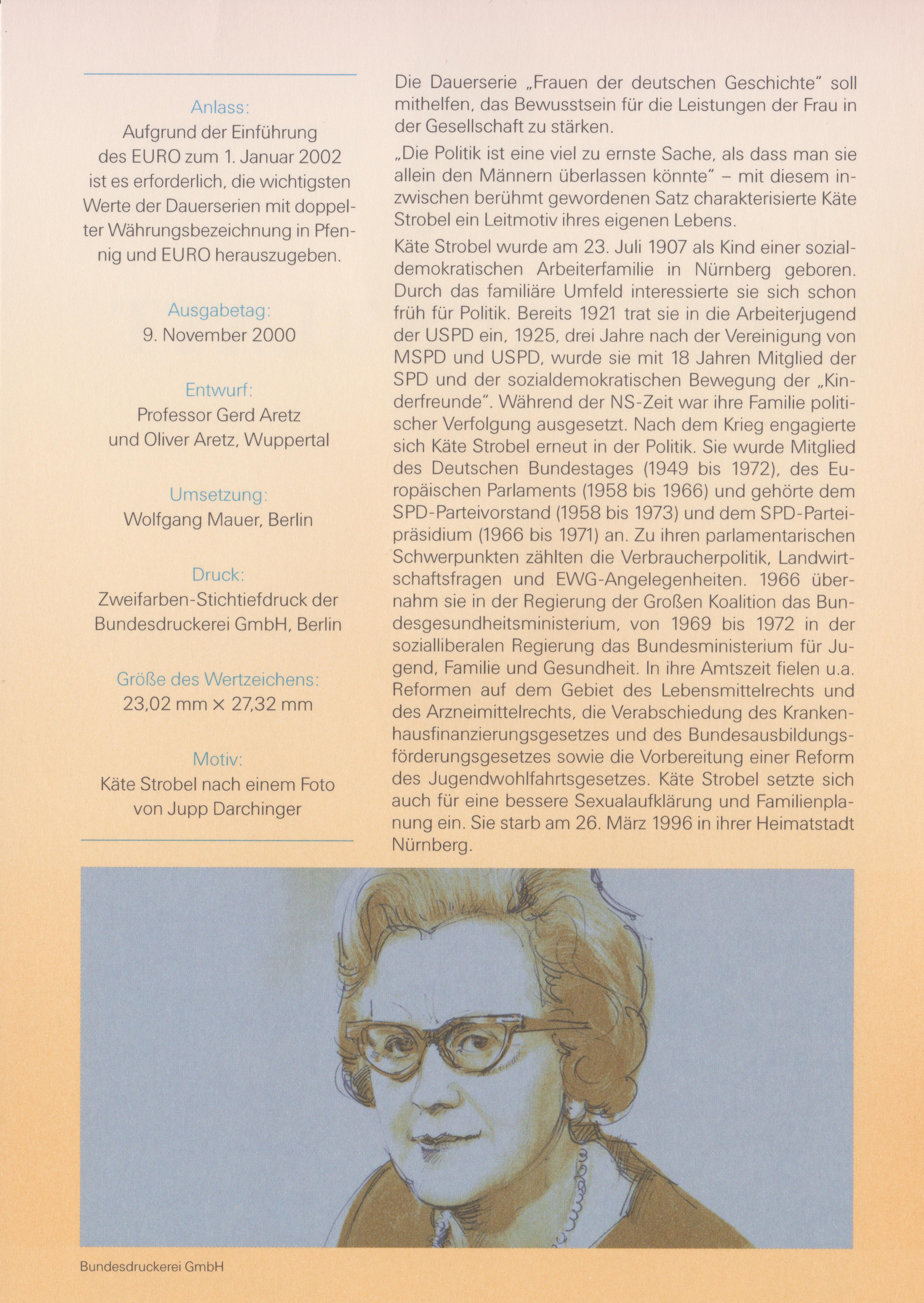 Das ERSTTAGSBLATT 49/2000 vom 09.11.2000 zeigt die Freimarke der Dauerserie "Frauen" in Doppelnominale mit dem Motiv "Käte Strobel":
