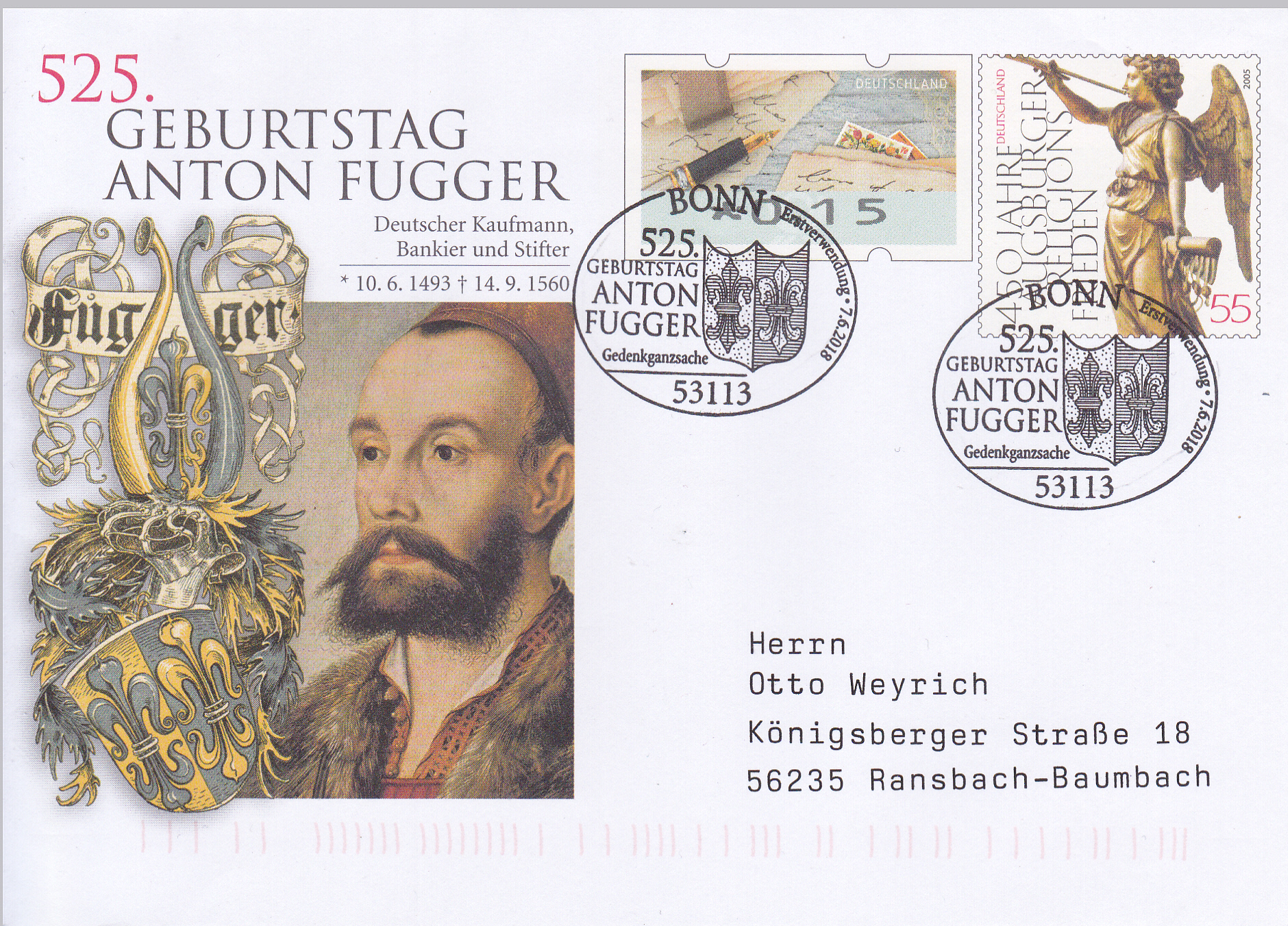 Zum 525. Geburtstag von Anton Fugger erschien bei der Deutschen Pst eine Gedenkganzsache. ier zeige ich eine solche gelaufene Ganzsache mit dem Erstverwendungsstempel Bonn.