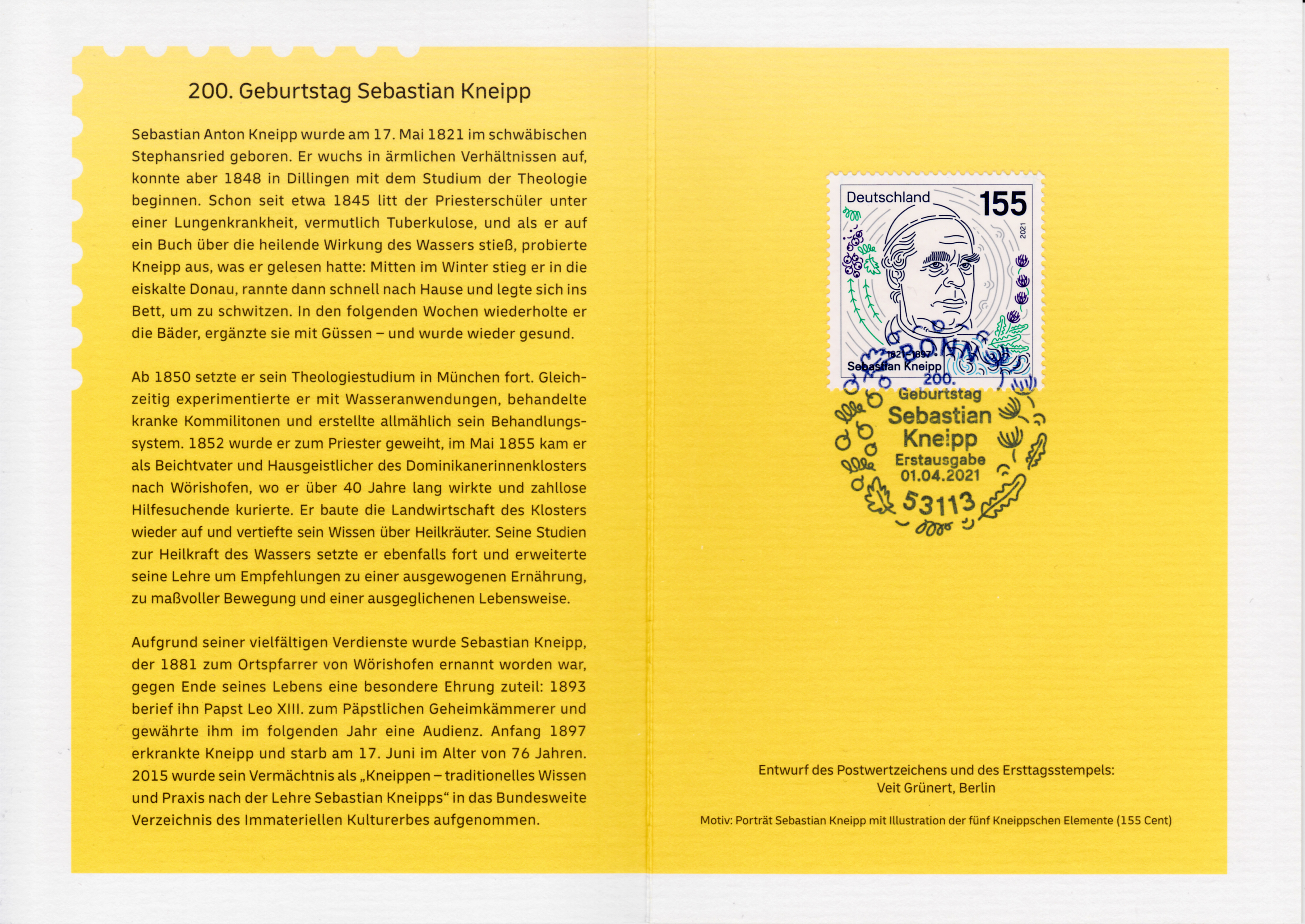Klappkarte des Vorstandsvorsitzenden der Deutschen Post AG mit der Marke zum 200. Geburtstag von Sebastian Kneipp (MiNr 3598) und dem Ersttagsonderstempel Bonn.