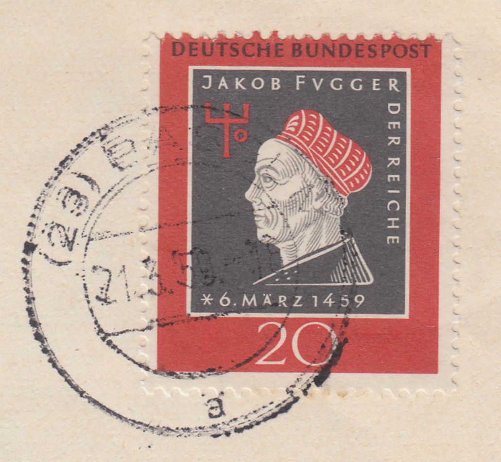 Hier folgt eine weitere Einzelfrankatur der Marke zum 500. Geburtstag von Jakob Fugger (MiNr 307) auf einem Fensterumschlag vom 6.3.1959, dem Ausgabetag der Marke, mit einem Sonderstempel aus Augsburg zur Markenausgabe.