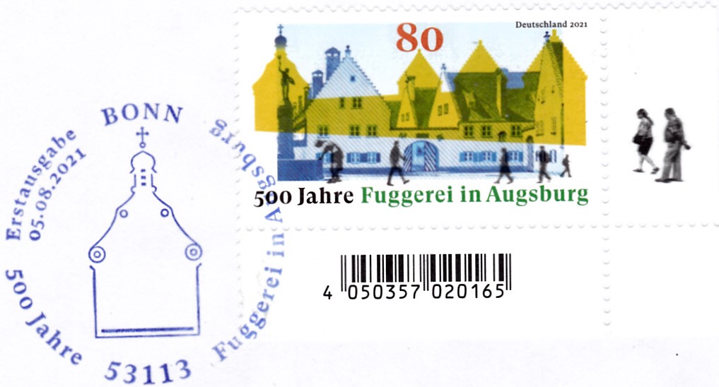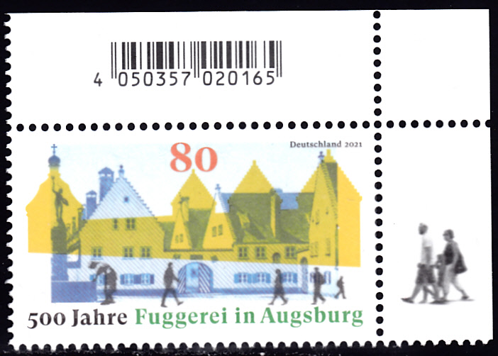 "500 Jahre Fuggerei in Augsburg" war für die Deutsche Post ein Anlass für eine Marke (MiNr 3621). Sie zeigt Gebäude der Fuggerei mit Frau am Brunnen und Passanten. Hier zeige ich ein Eckrandstück mit EAN-Codierung.