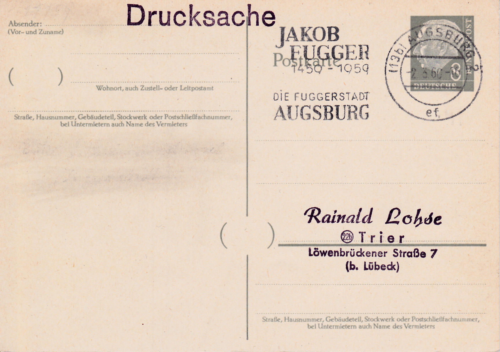 Maschinen-Werbestempel vom 2.3.1960 aus Augsburg 2 mit Kennbuchstaben "ef" und dem Werbeeinsatz zum 500. Geburtstag von Jakob Fugger auf einer als "Drucksache" verschickten Orts-Postkarte 8Pf Heuss.