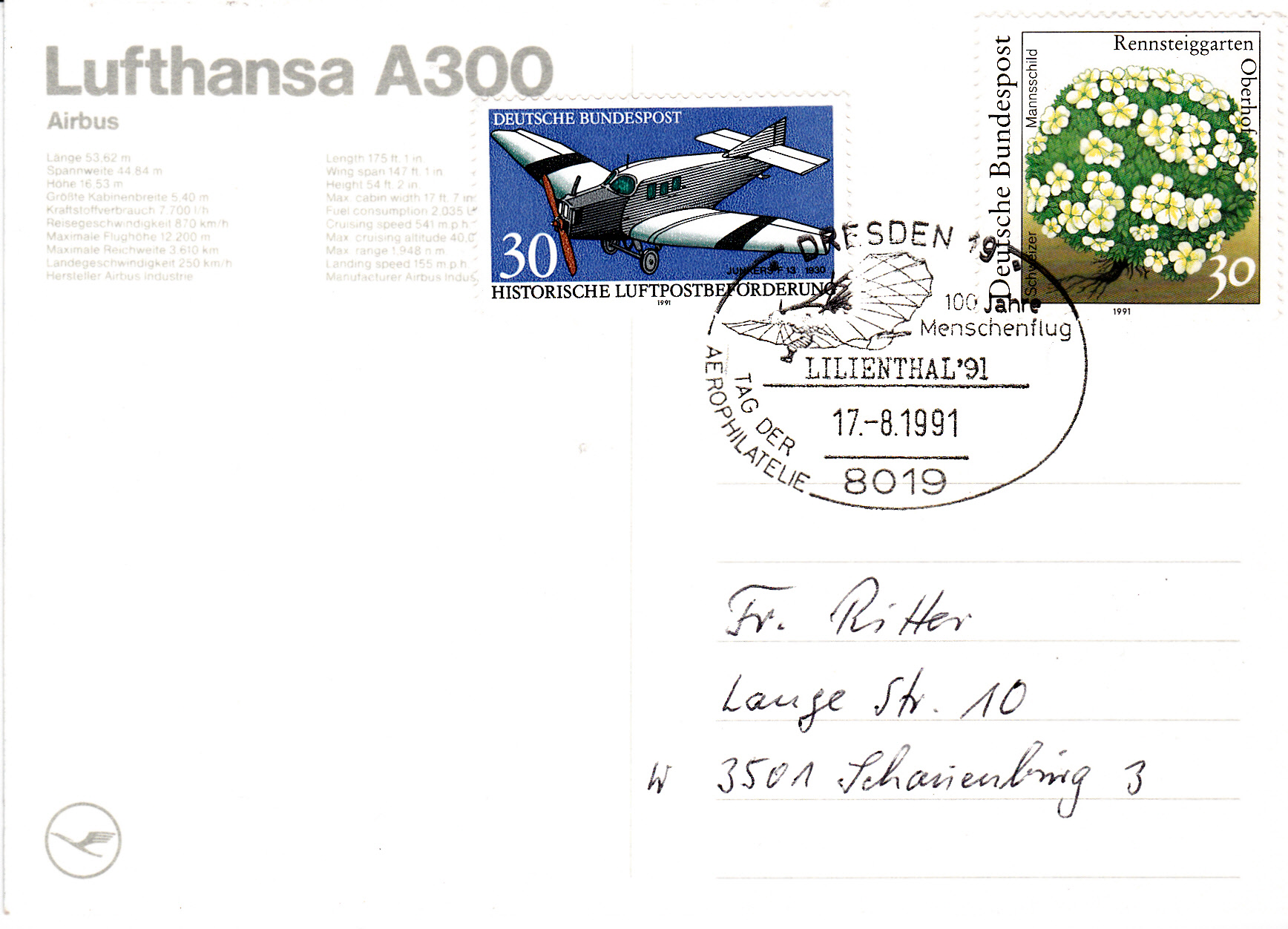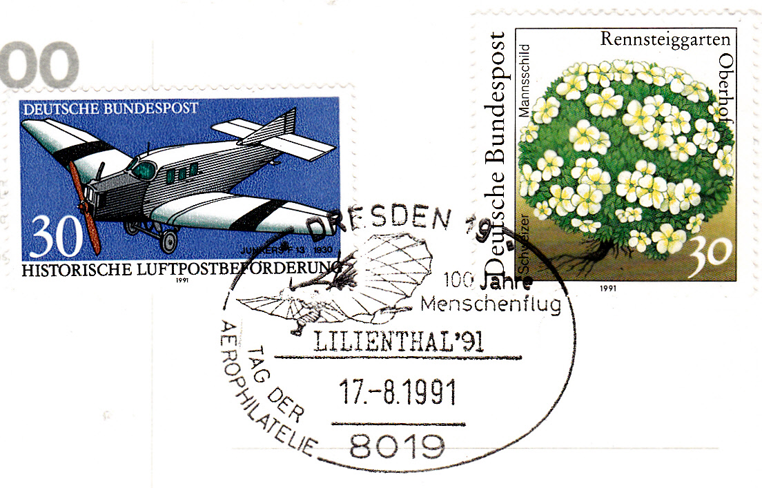 Sonderstempel aus Dresden vom 17.8.1991 zur Ausstellung LILIENTHAL'91 und zum Jubiläum "100 Jahre Menschenflug".