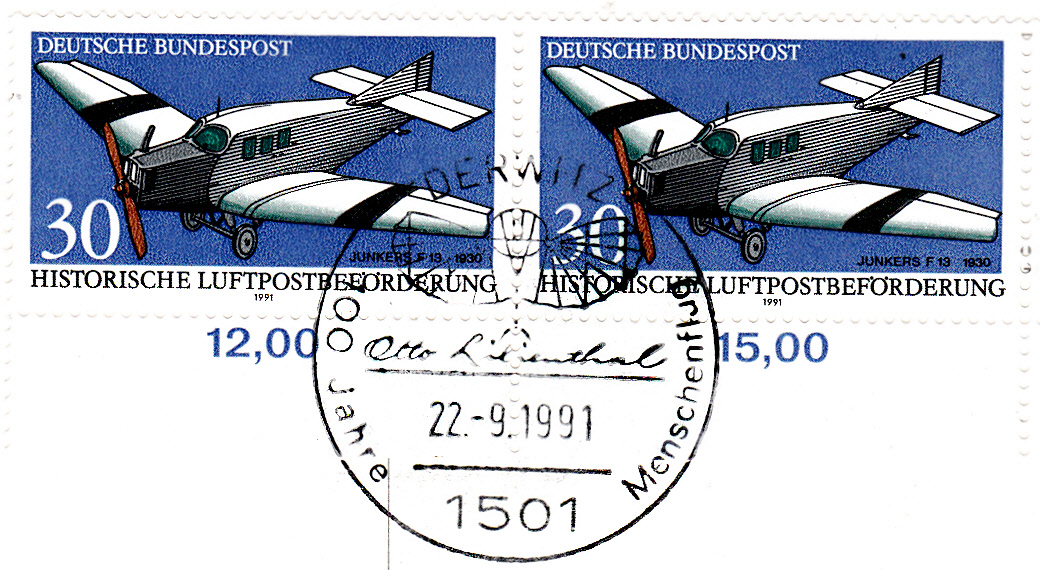 Sonderstempel vom 22.9.1991 aus Derwitz zum Jubiläum "100 Jahre Menschenflug" mit der Abbildung des Fluggerätes und der Unterschrift von Otto Lilienthal. In Derwitz führte Lilienthal sein Flugversuche durch.