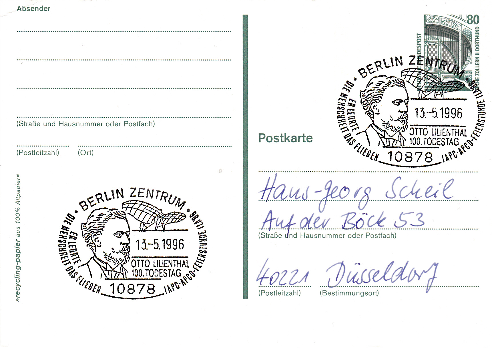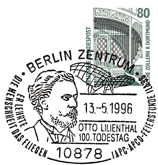 Sonderstempel vom 13.5.1996 zum 100. Todestag von Otto-Lilienthal mit seinem Porträt im Stempelbild.