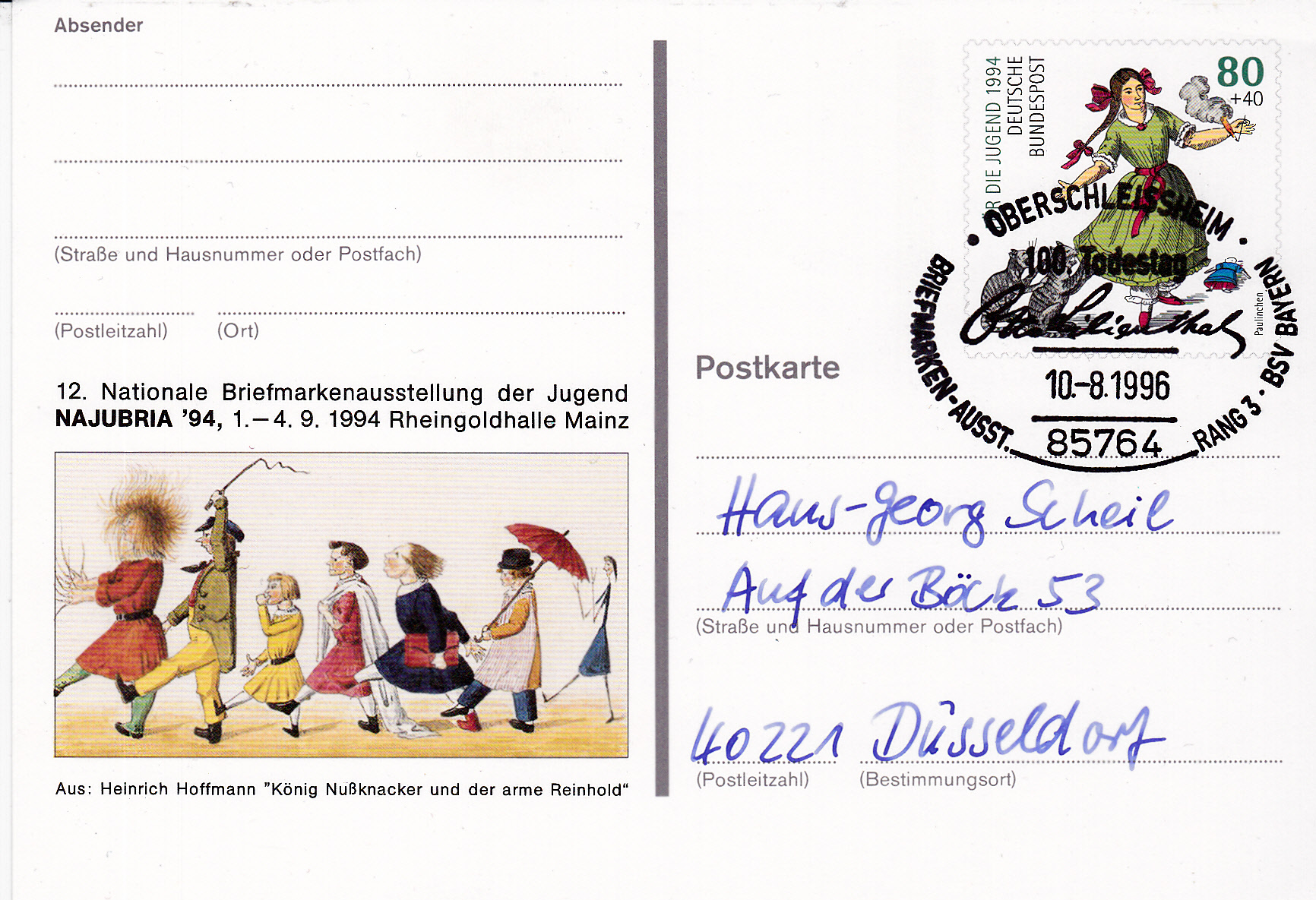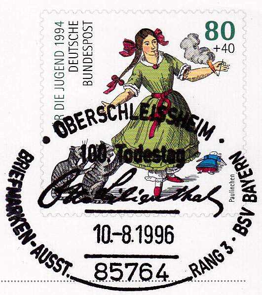 Sonderstempel vom 10.8.1996 aus Oberschleissheim zum 100. Todestag von Otto Lilienthal. Im Stempel wird die Unterschrift von Otto Lilienthal gezeigt.