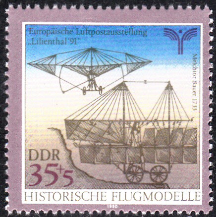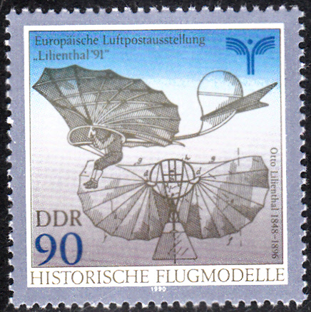 Zur Europäischen Luftpostausstellung "Lillienthal'91" ist 1990 in der DDR diese Marke (MiNr 3314) erschienen. Sie zeigt den "Normalsegelapparat" von Otto Lilienthal.