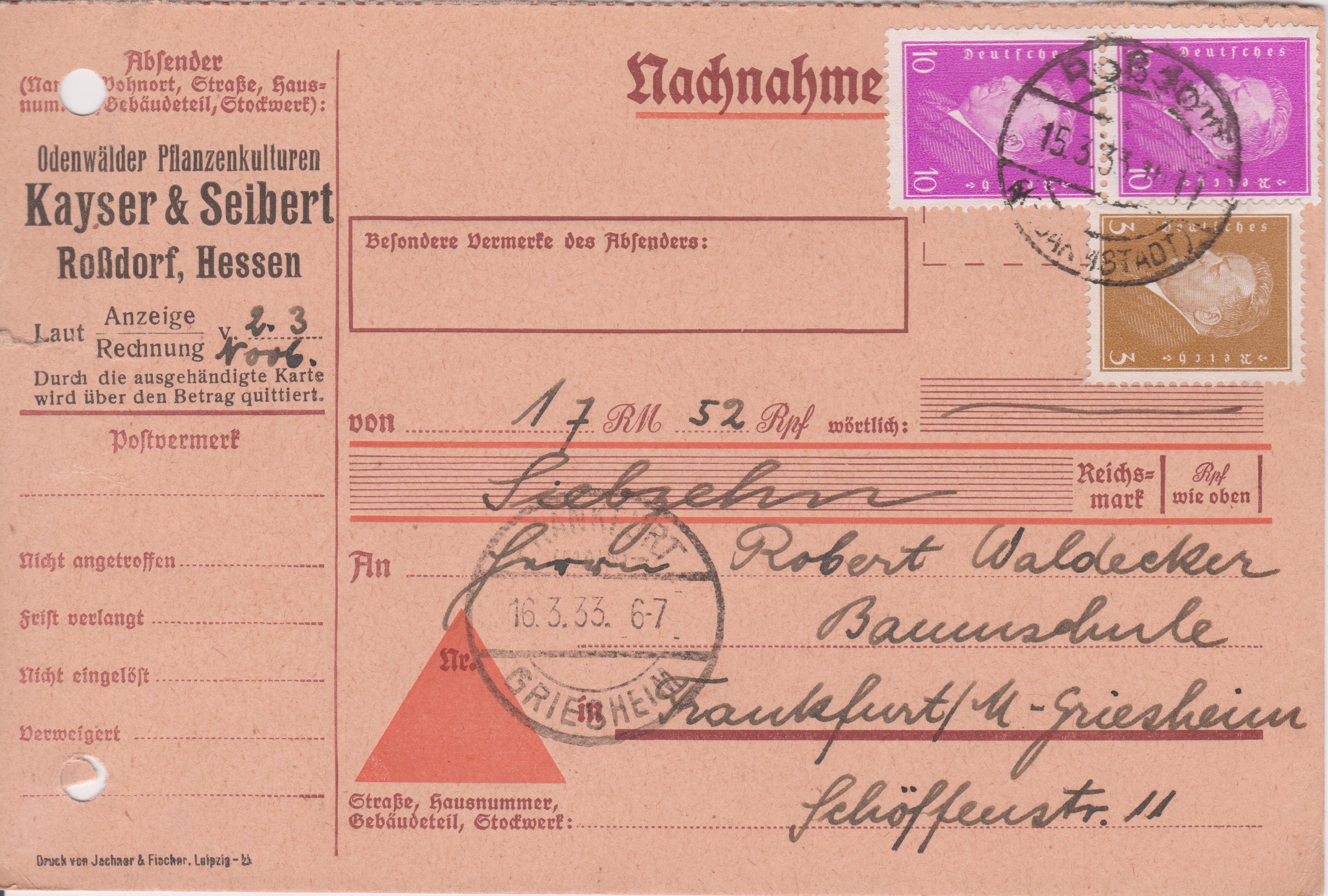 Drucksache, Porto 3 Pf, per Nachnahme, Porto 20 Pf, ergibt die Portostufe 23 Pf, hier am 15.03.1933 dargestellt per Mischfrankatur der Freimarken Reichspräsidenten, 2x Deutsches Reich MiNr. 413 sowie 1x Deutsches Reich MiNr. 410:
