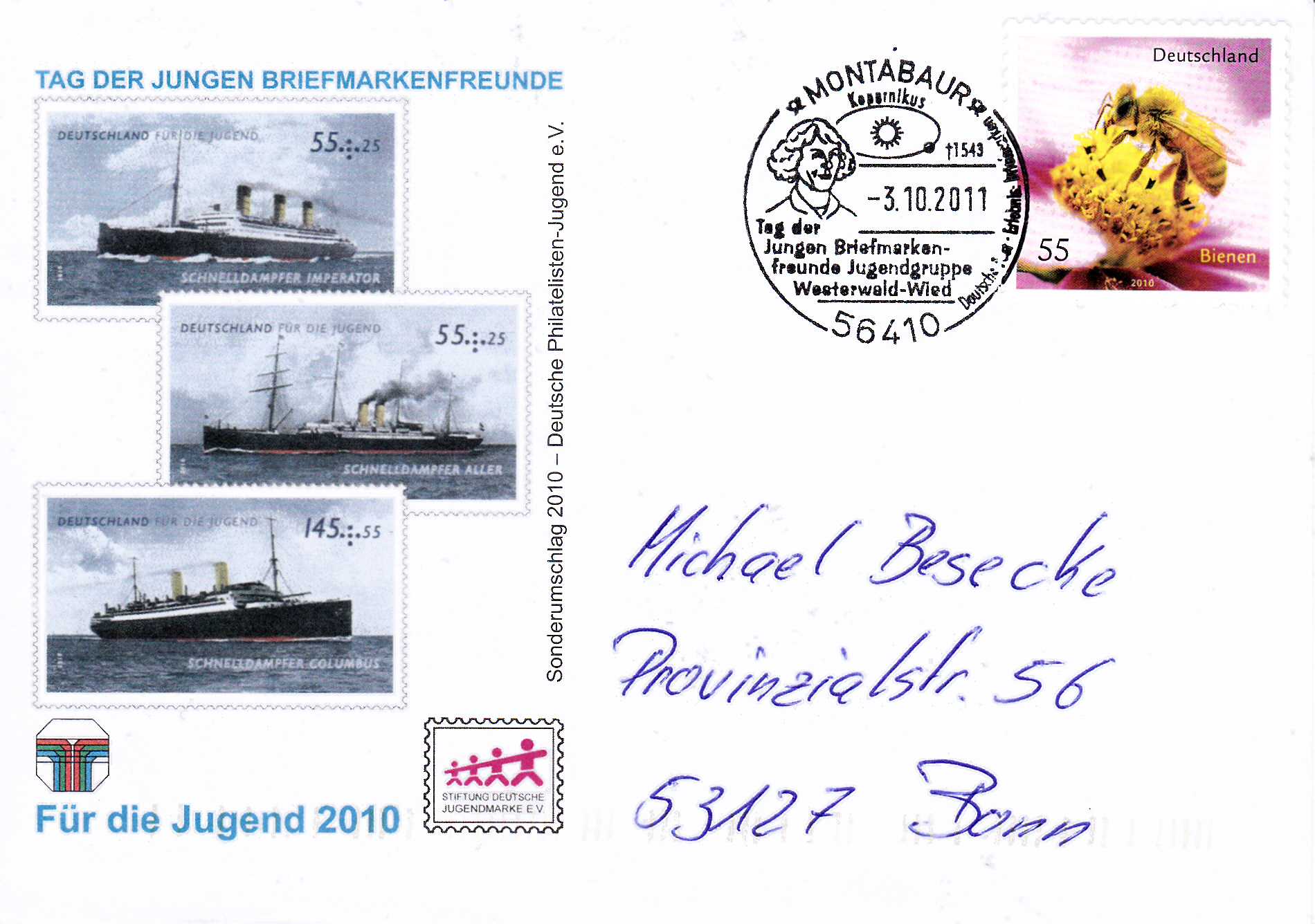 Zu diesem Umschlag wurde in Bonn ein Erstverwendungsstempel verwendet.