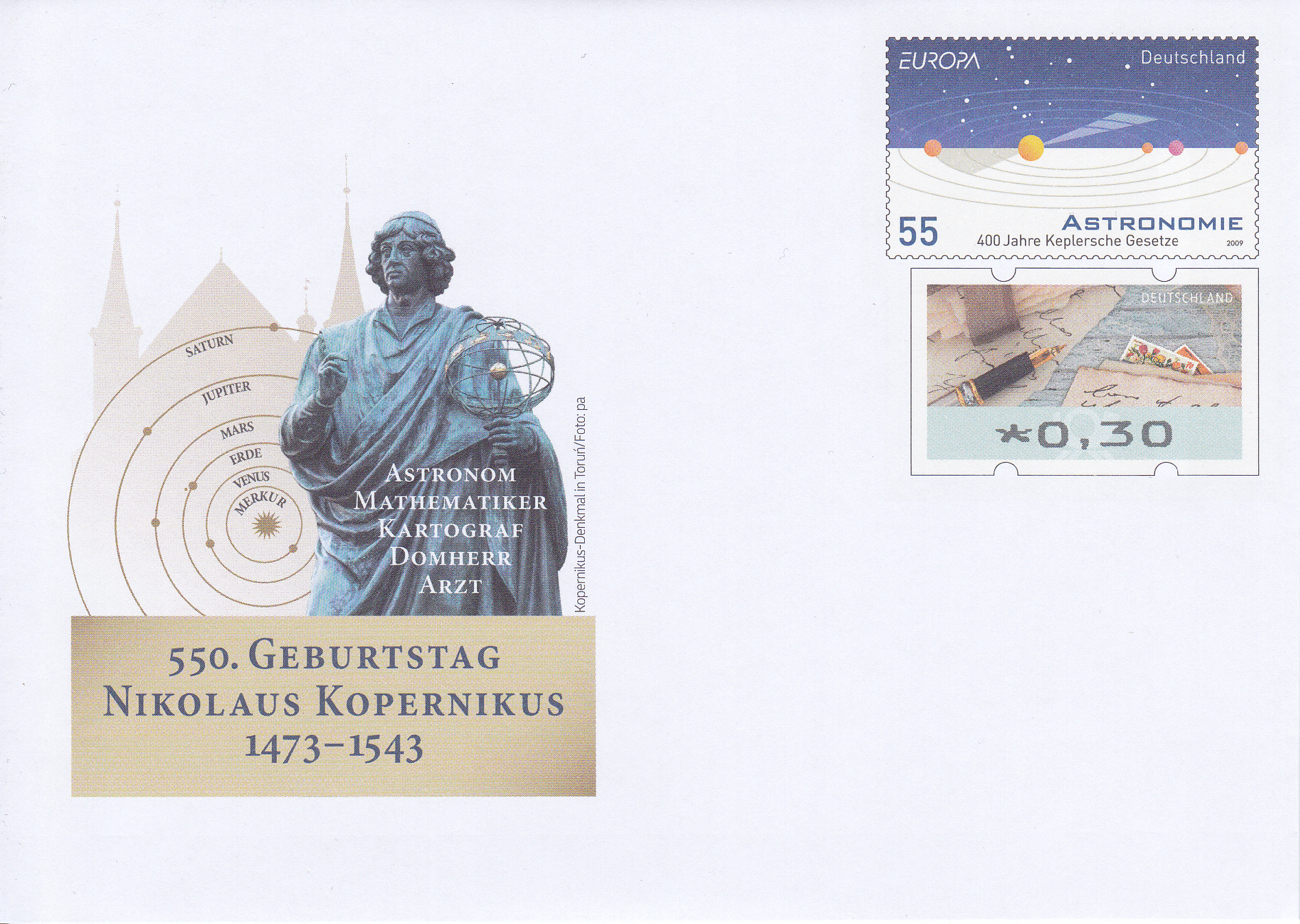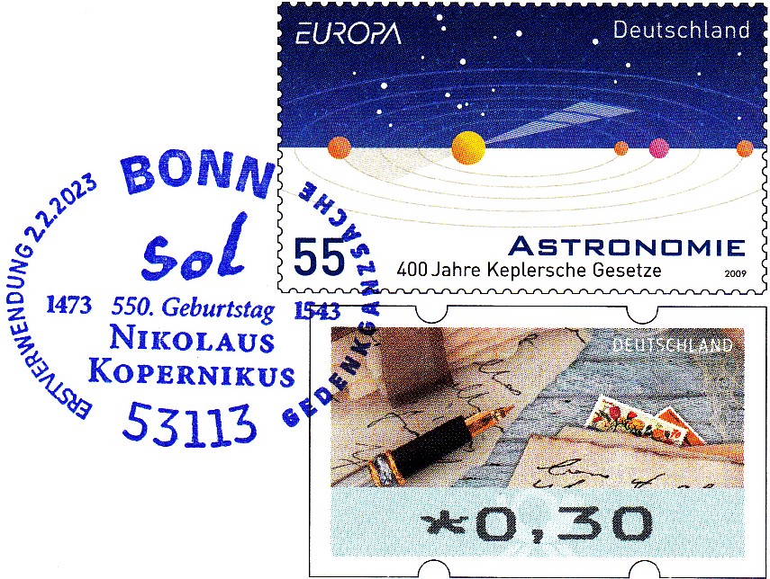 Zum 550. Geburtstag von Nikolaus Kopernikus erschien bei der Deutschen Post ein Gedenkumschlag mit dem Werteindruck im Muster der Europamarke von 2009 (MiNr 2732) und einer Automatenmarke zu 0,30€.