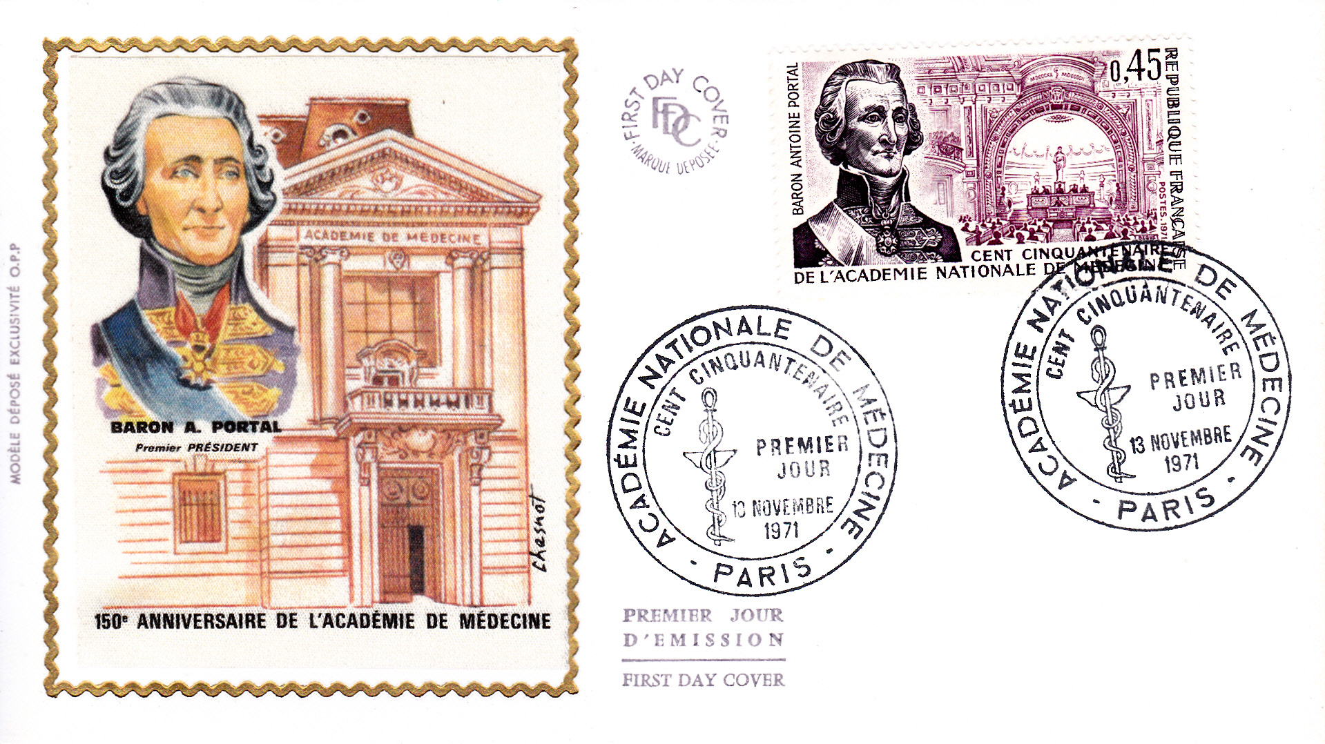 Er ist auf einer Marke aus Frankreich (MiNr 1776) anlässlich des Jubiläums "150 Jahre Nationalakademie für Medizin" abgebildet.
