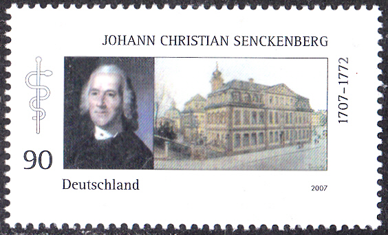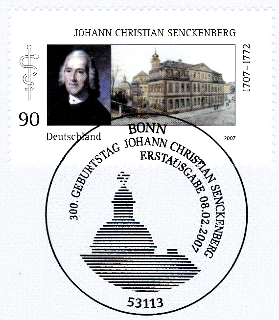Zum 300. Geburtstag von Johann Christian Senckenberg erschien bei der Deutschen Post diese Marke (MiNr 2588) mit einem Porträt von Senckenberg und dem Bürgerhospital in Frankfurt am Main.