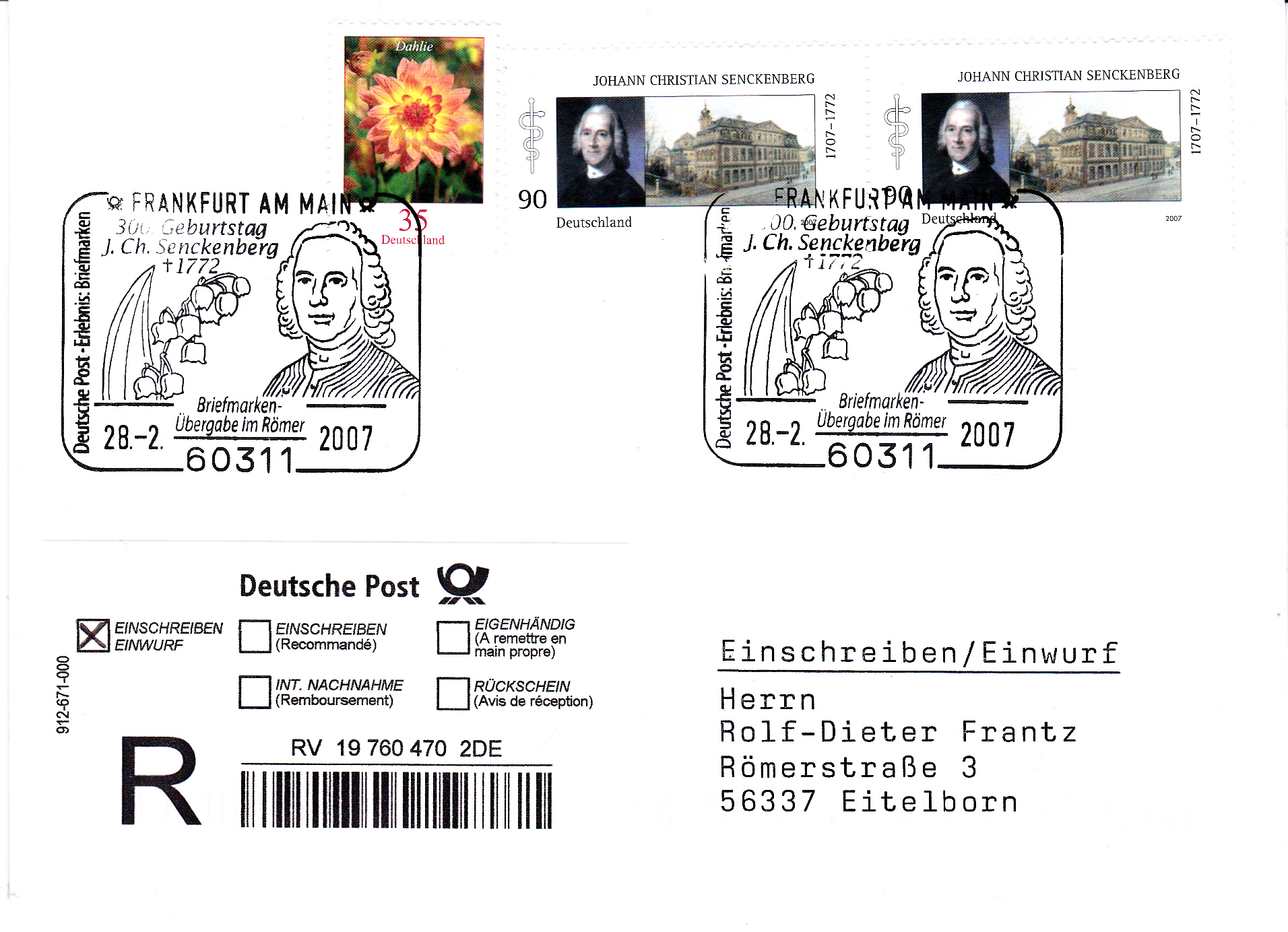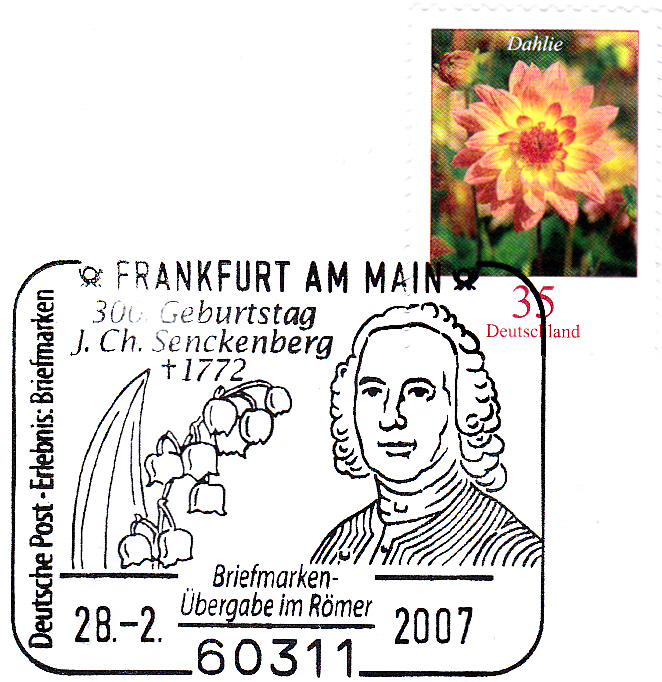 Sonderstempel aus Frankfurt am Main vom 28.2.2007 zur Briefmarkenübergabe der Marke zum 300. Geburtstag von Johann Christian Senckenberg zum im Frankfurter Römer. Der Einwurf-Einschreiben wurde mit zwei Marken MiNr 2588 und einer Marke zu 35Cent aus der DS "Blumen" (MiNr 2505) frankiert. Im Sonderstempel werden ein Maiglöckchen und ein Porträt von Senckenberg gezeigt.