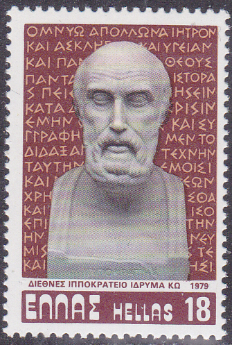 Auf einer Marke "Internationales Hippokrates-Institut, Insel Kos" aus Griechenland (MiNr 1385) wird eine Büste mit Hippokrates Büste von Ioannis Kossos (1832-1875) gezeigt.