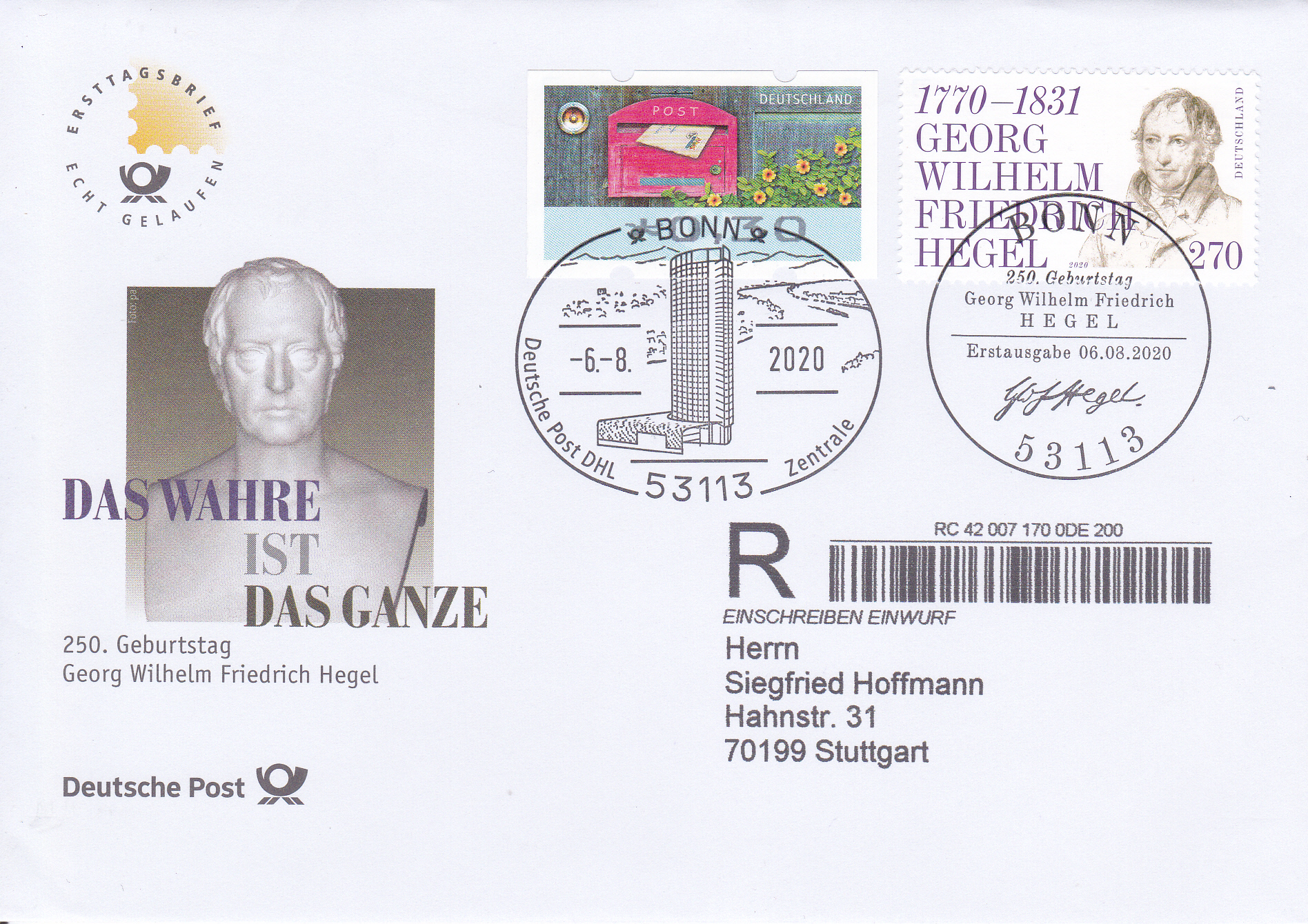 Ersttagsbrief der Deutschen Post per Einschreiben Einwurf mit der Marke zum 250. Geburtstag von Georg Wilhelm Friedrich Hegel (MiNr 3560) und dem Ersttagsonderstempel Bonn und der Zusatzfrankatur einer Automatenmarke zu 0,45 € mit einem Stempel der Deutschen Post DHL Zentrale in Bonn. Der "Einschreibezettel" wurde bei diesem Brief (ein Ersttagabrief aus dem Abo der Deutschen Post) beim Adressieren direkt aufgedruckt.