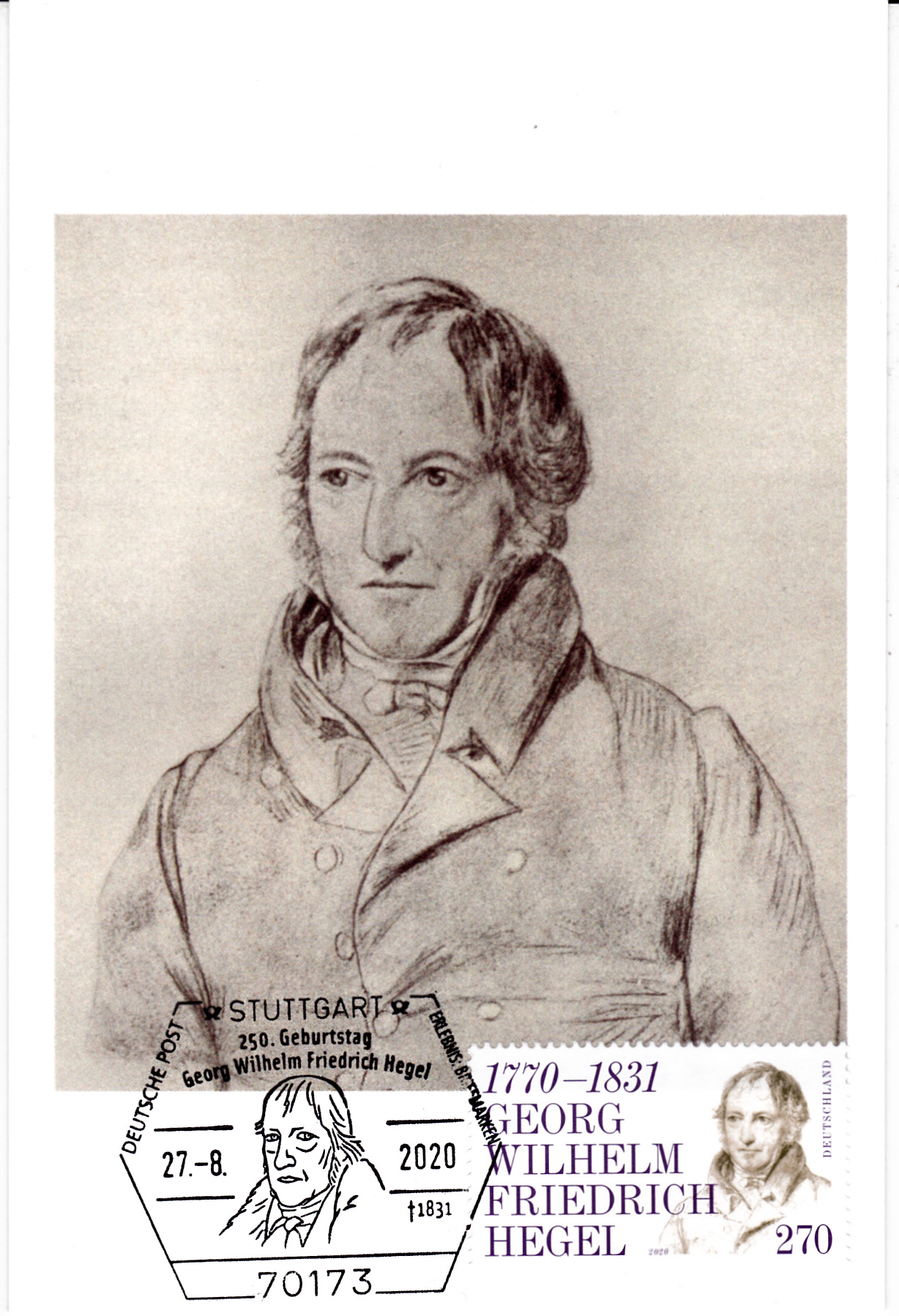 Bereits zum 200. Geburtstag von Georg Wilhelm Friedrich Hegel war bei der Deutschen Bundespost eine Marke (MiNr 617) mit seinem Porträt erschienen.