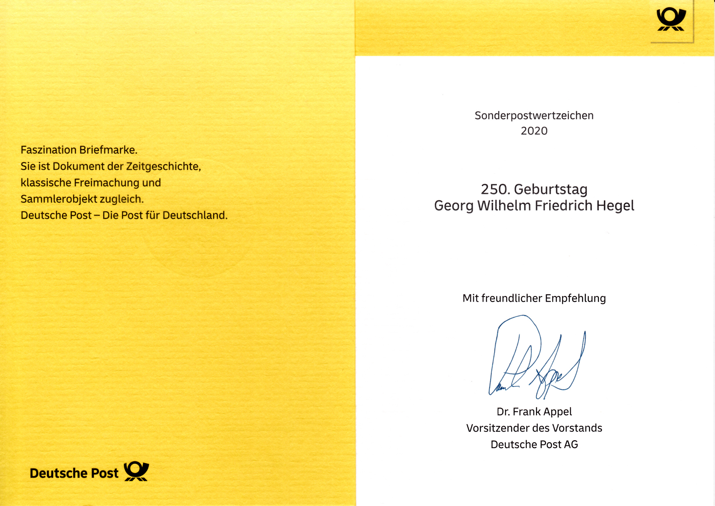 Klappkarte des Vorstandsvorsitzenden der Deutschen Post AG mit einer Marke zum 250. Geburtstag von Georg Wilhelm Friedrich Hegel (MiNr 3560) und dem Ersttagsonderstempel Bonn.