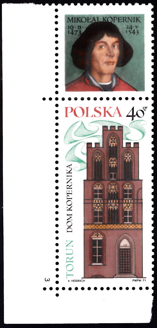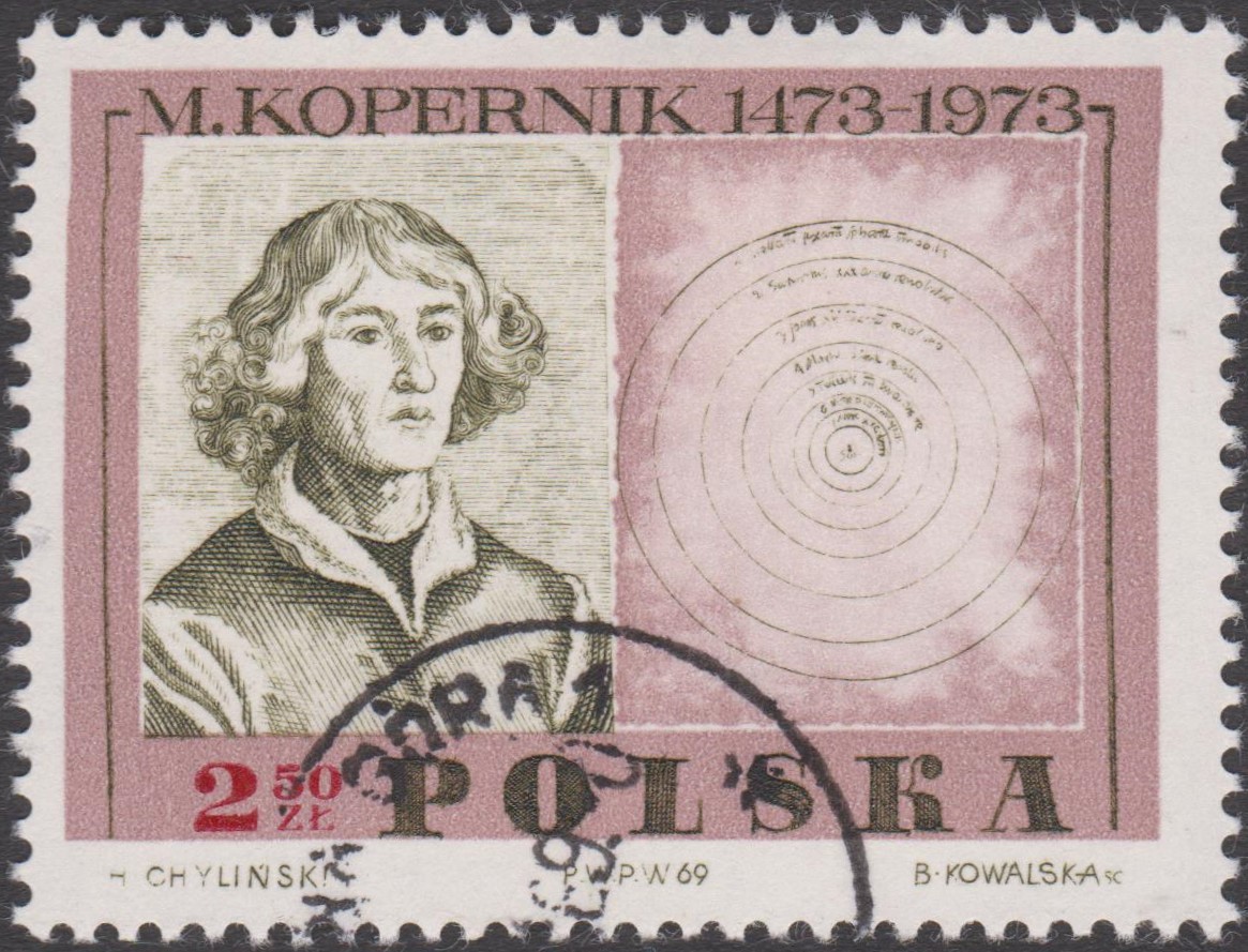 Zum 500. Geburtstag von Nikolaus Kopernikus ist in Polen in einer Serie mit Holzschnitten aus der "Weltchronik" von Hartmann Schedel (1440-1514, deutscher Arzt und Humanist) diese Marke (MiNr 2015) mit "Padua um 1500" und mit Nikolaus Kopernikus nach einer Miniatur von Vincent de Lesseur (1745-1813, ital. Maler) erschienen.