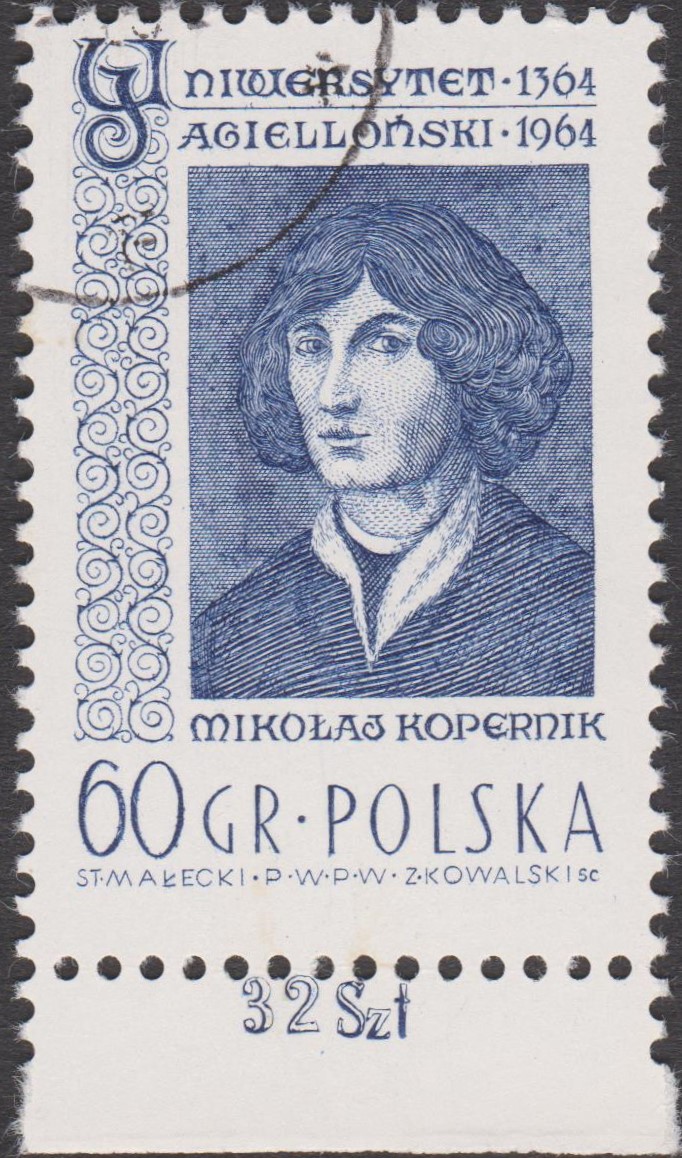Zum 500. Geburtstag von Nikolaus Kopernikus ist in Polen in einer Serie mit Holzschnitten aus der "Weltchronik" von Hartmann Schedel (1440-1514, deutscher Arzt und Humanist) diese Marke (MiNr 2014) mit "Bologna um 1500" und mit Niolaus Kopernikus nach einer Miniatur von Marceli Bacciarelli (1731-1818, ital. Maler) erschienen.