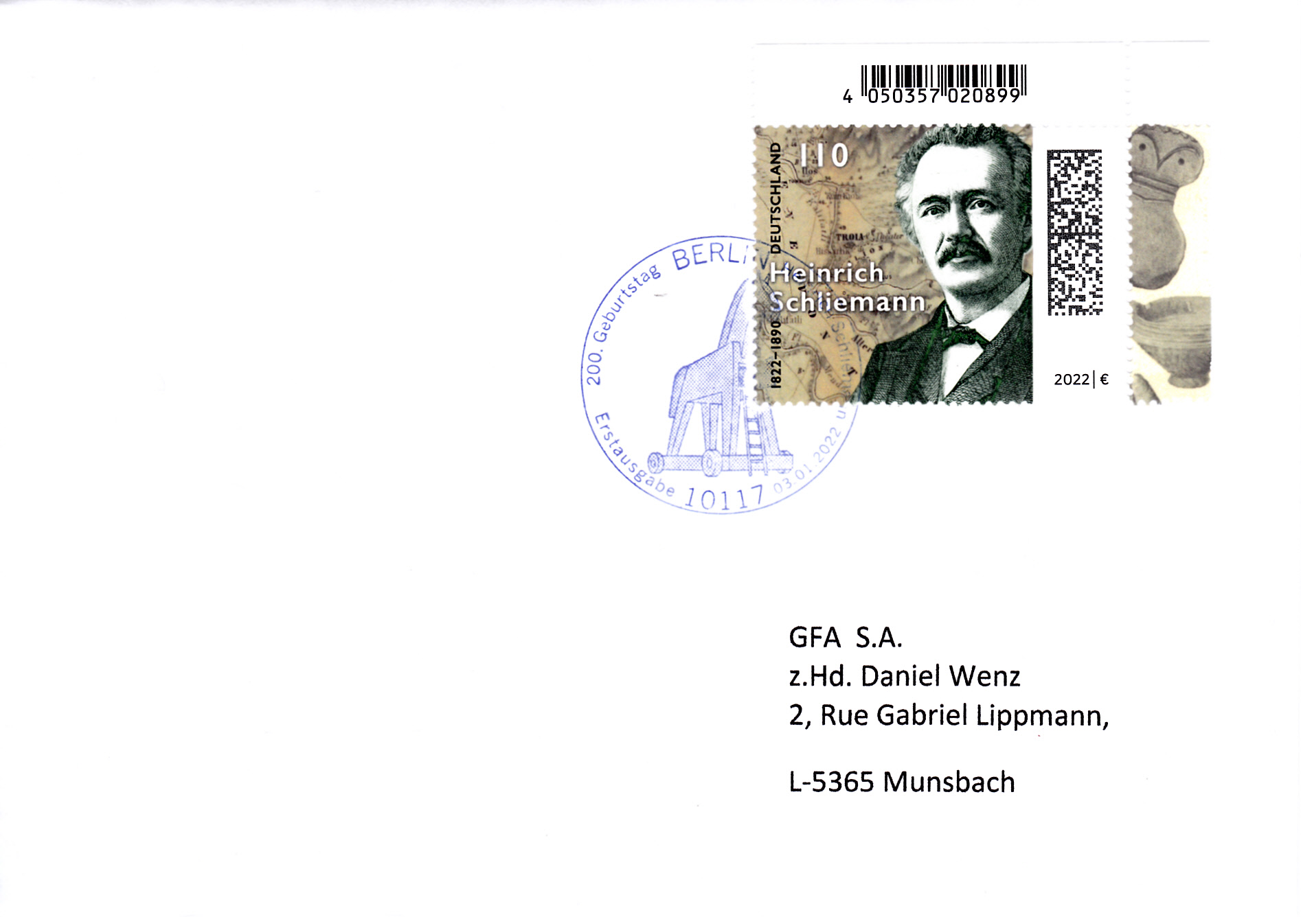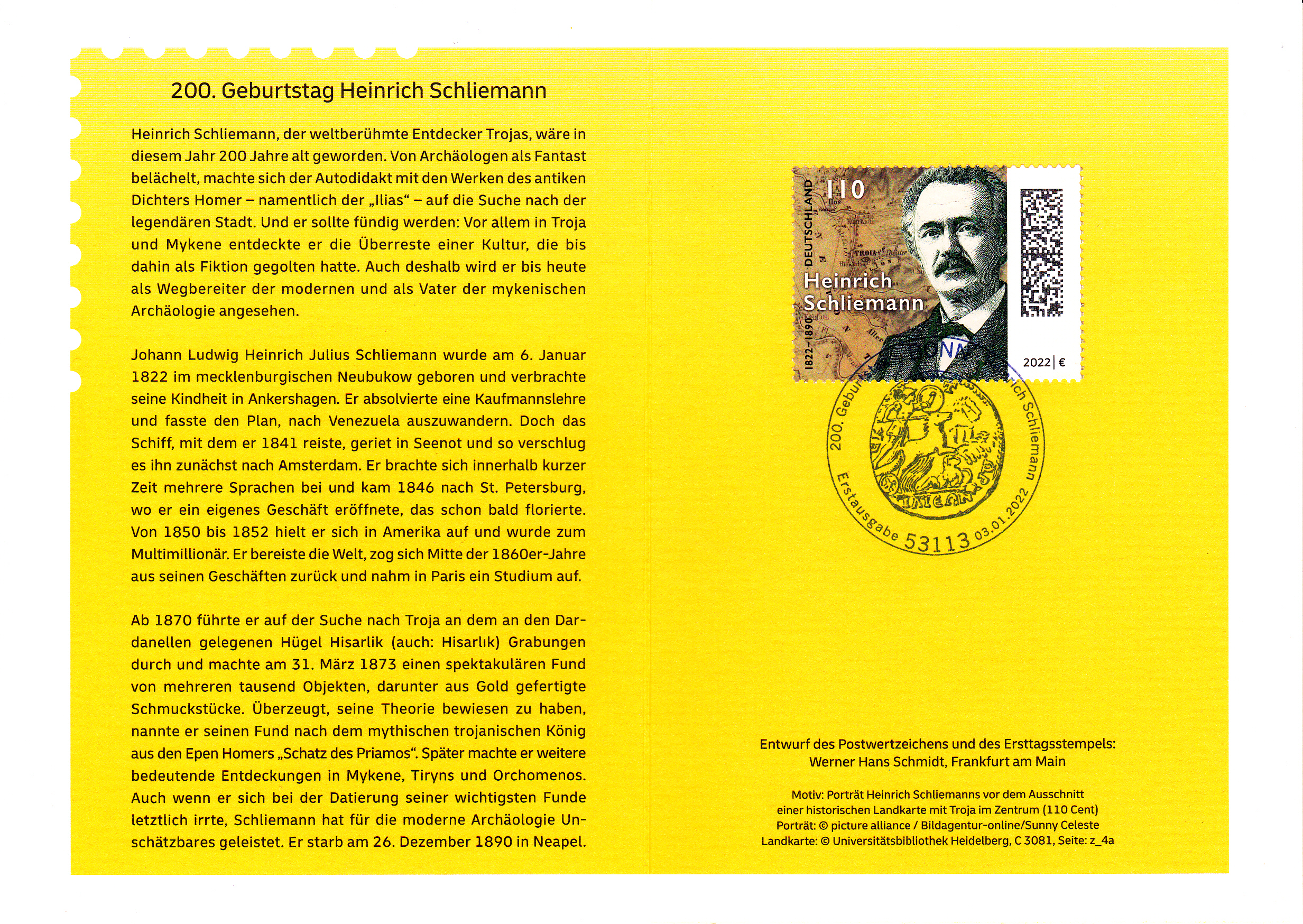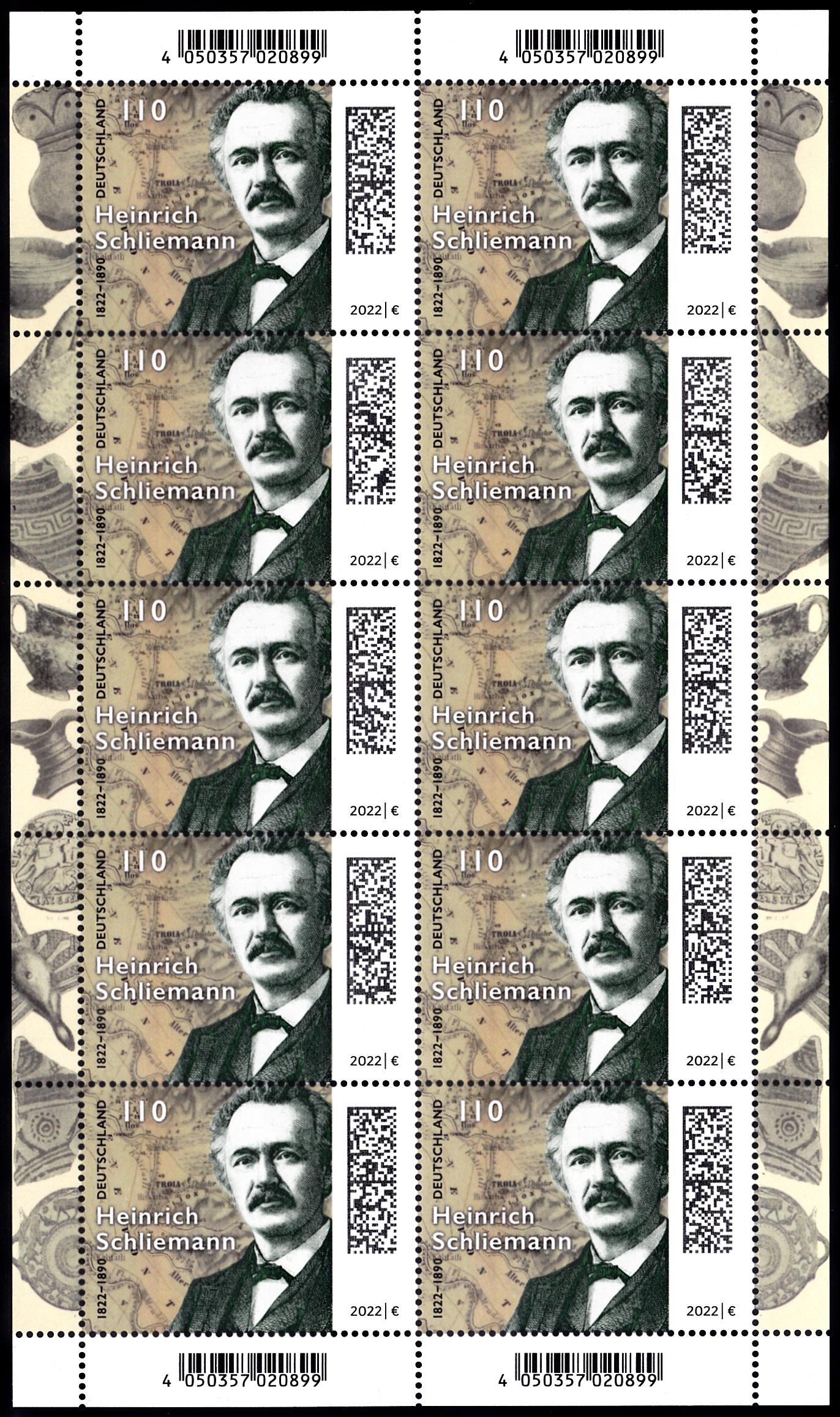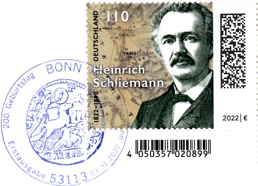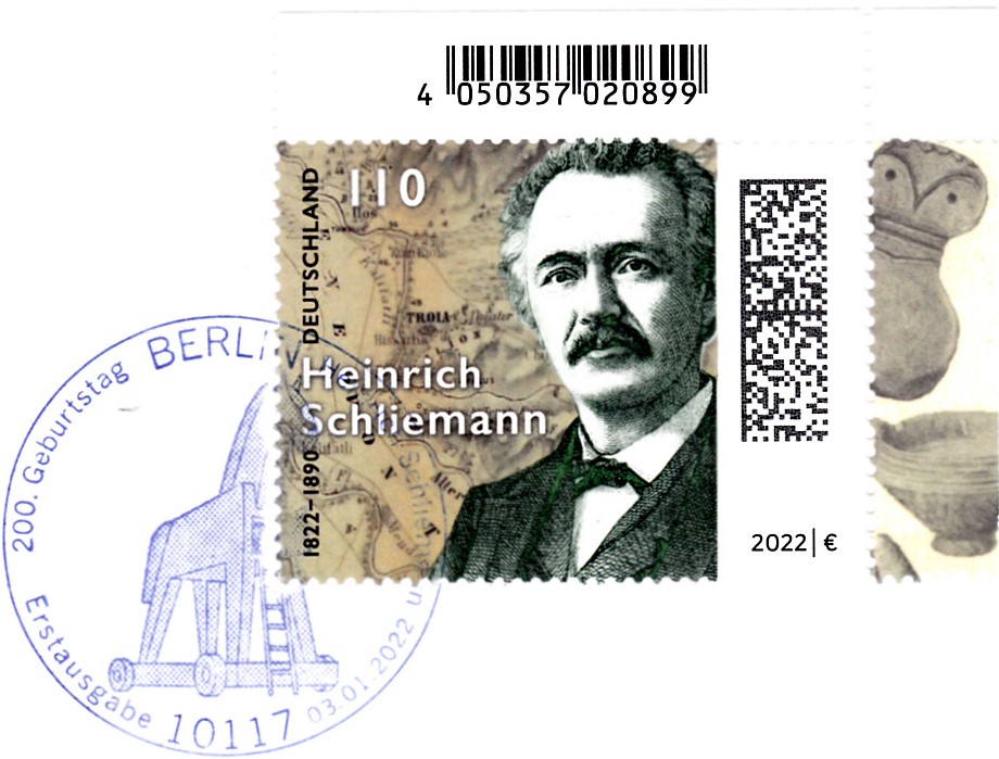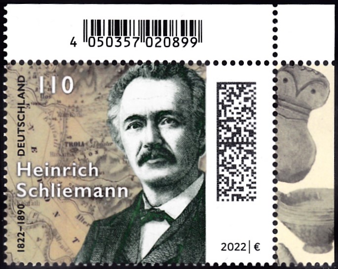 Zum 200. Geburtstag von Heinrich Schliemann erschien bei der Deutschen Post eine Marke (MiNr 3659) mit einem Porträt von Heinrich Schliemann vor einer historischer Landkarte. Hier zeige ich ein Eckrandstück mit EAN-Codierung.
