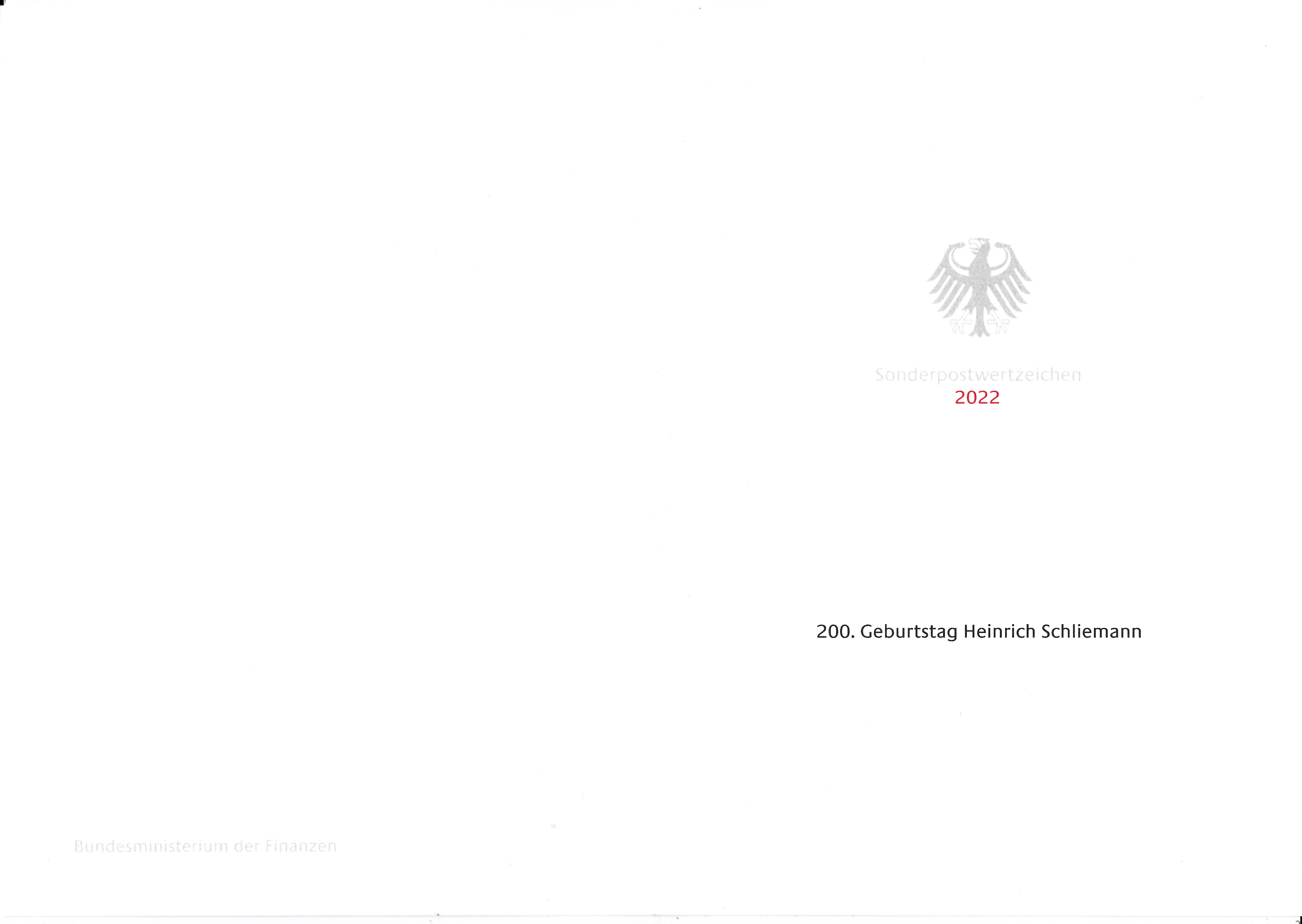 Ministerkarte des Bundesministers für Finanzen mit zwei Marken zum 200. Geburtstag von Heinrich Schliemann (MiNr 3659) und den beiden Ersttagsonderstempel Bonn und Berlin.