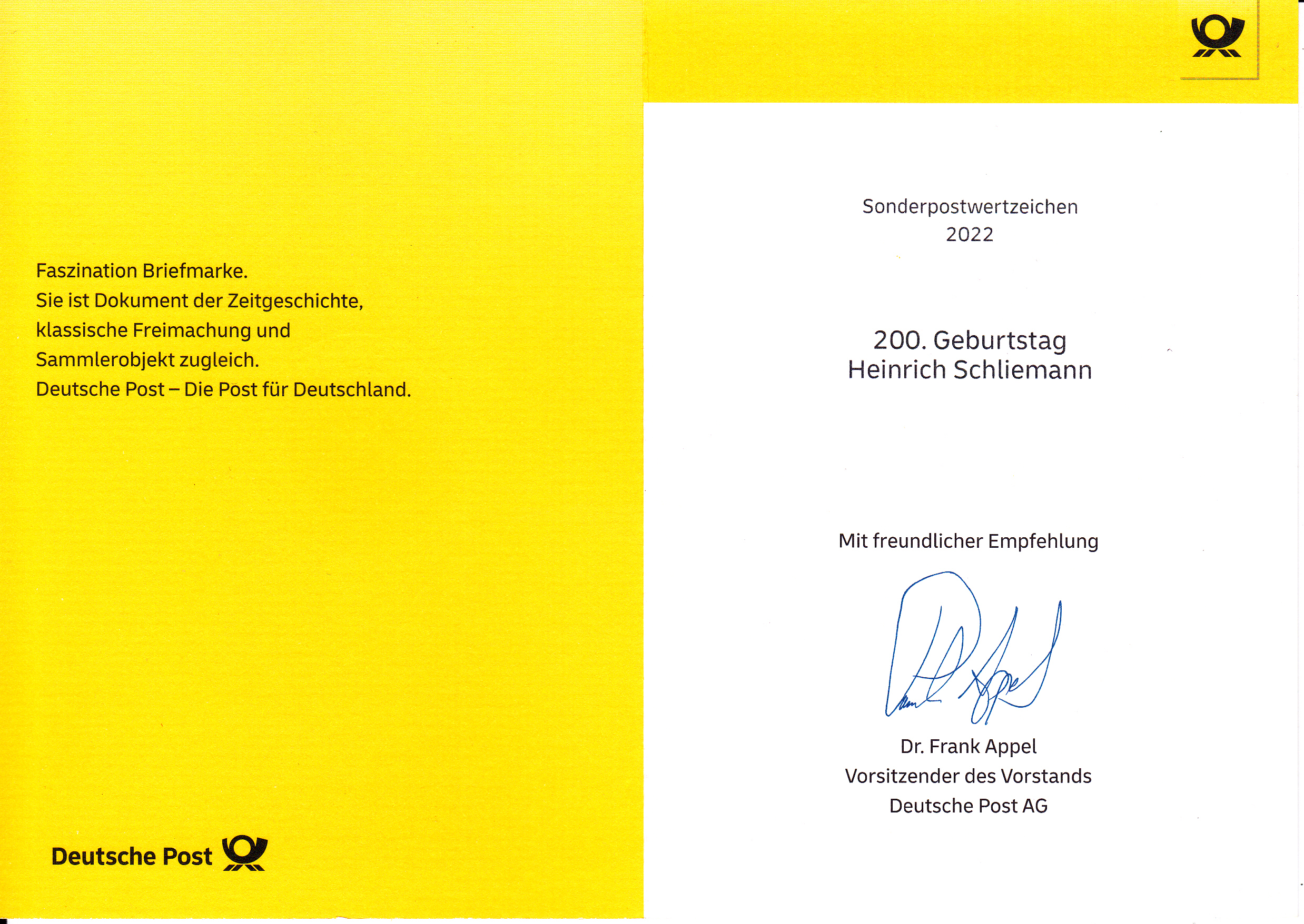 Klappkarte des Vorstandsvorsitzenden der Deutschen Post AG mit der Marke "200. Geburtstag von Heinrich Schliemann" (MiNr 3659) und dem Ersttagsonderstempel Bonn.