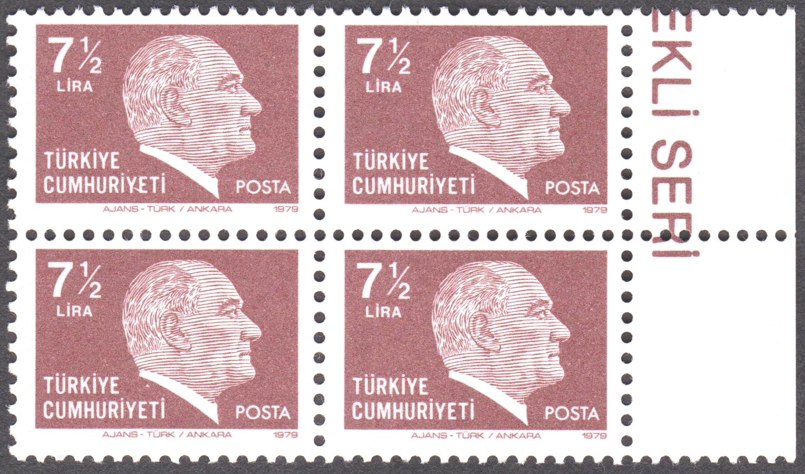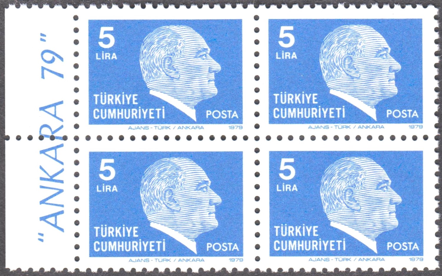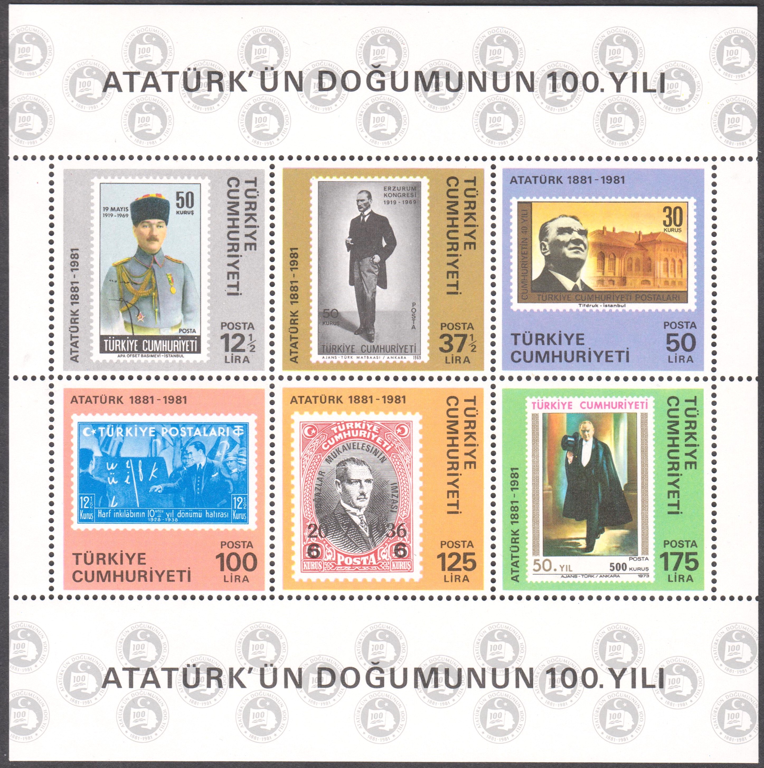 Türkei Block 19 mit MiNr. 2557-2562 erschien am 19.05.1981 in einer Auflage von 500 000 Blocks und zeigt 6 Postwertzeichen der Türkei mit Bildnissen von Kemal Atatürk: