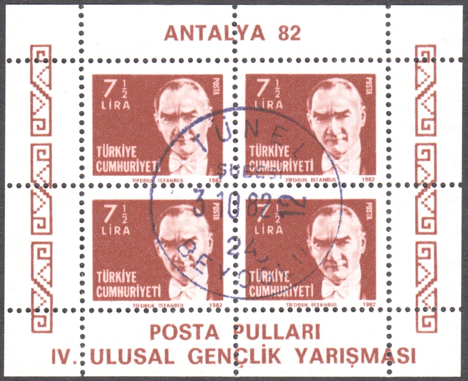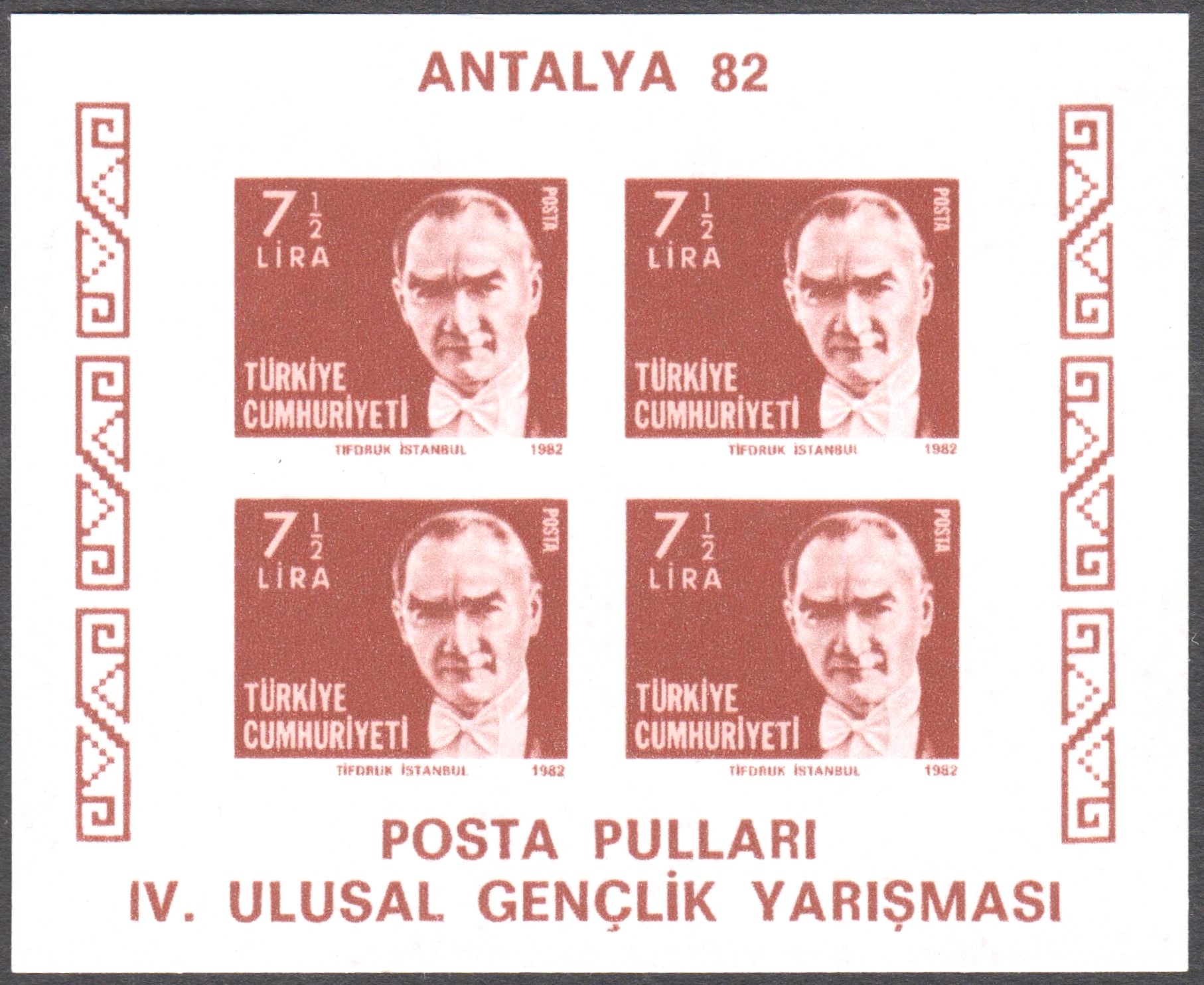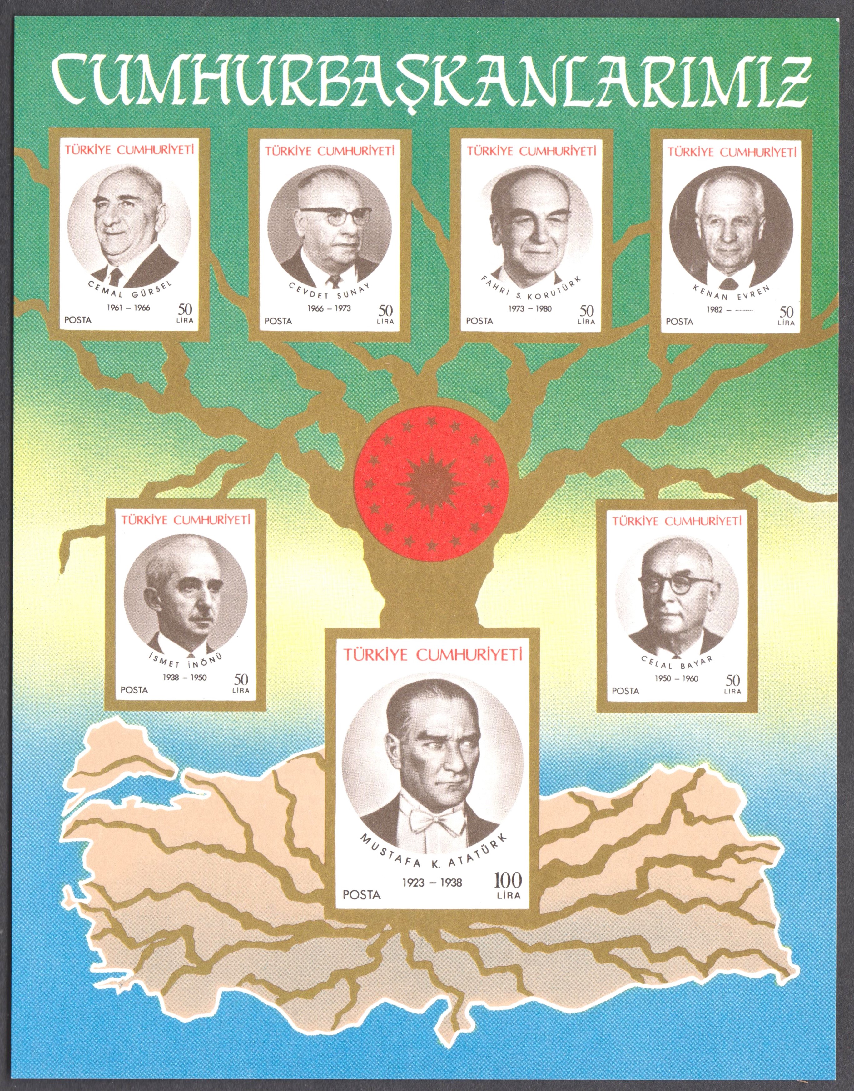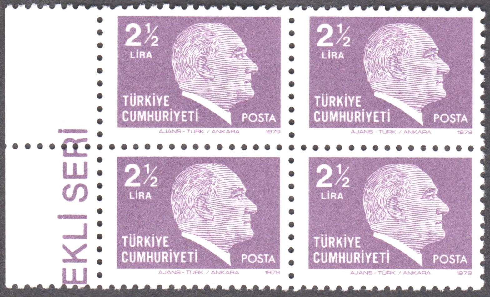 Türkei Block 19 mit MiNr. 2557-2562 erschien am 19.05.1981 in einer Auflage von 500 000 Blocks und zeigt 6 Postwertzeichen der Türkei mit Bildnissen von Kemal Atatürk: