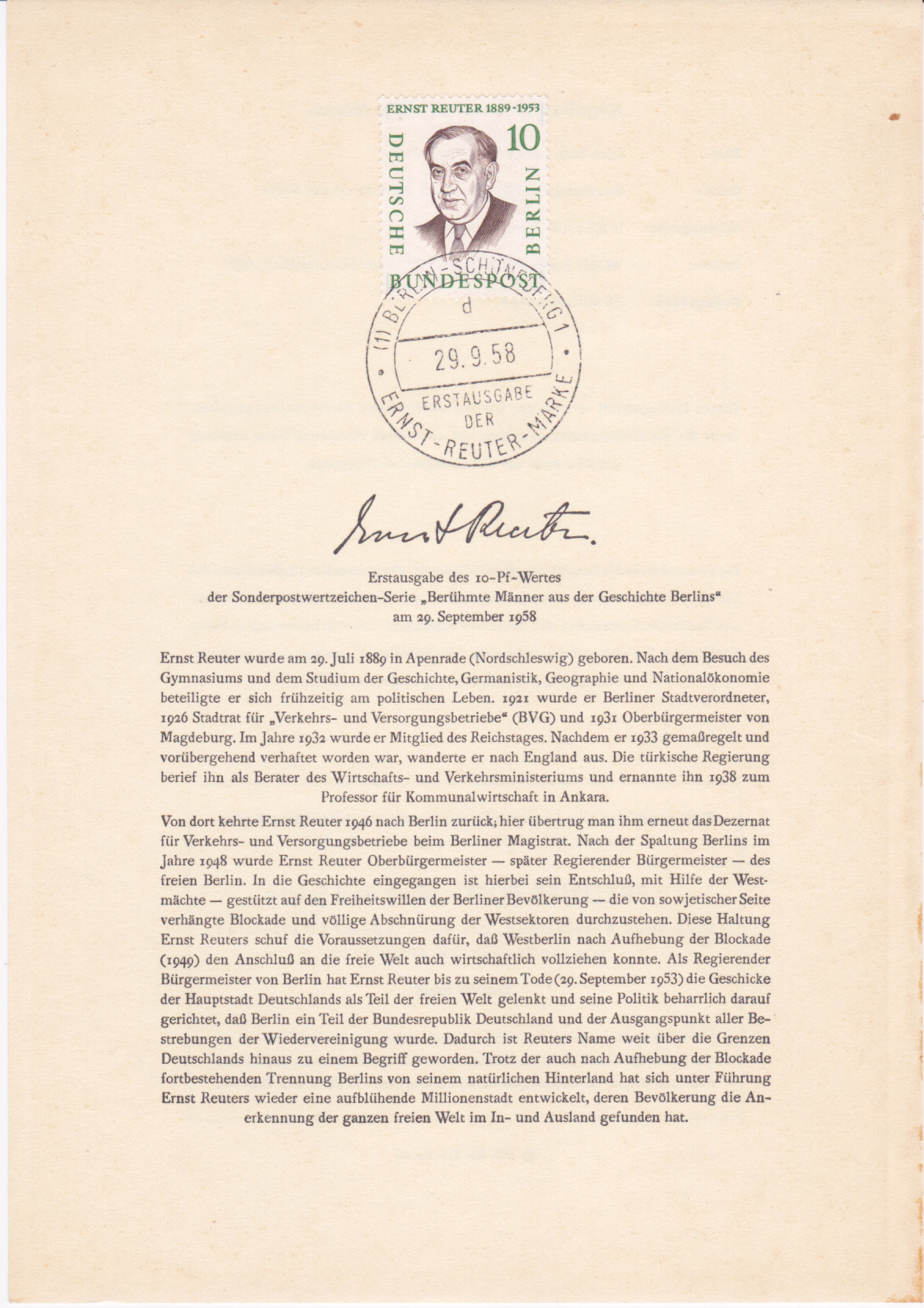 Die Marke zu 10 Pf (MiNr 165) mit Prof. Dr. Ernst Reuter (1889-1953, Politiker, reg. Bürgermeister von Berlin) erschien am 29.9.1958 in der Serie "Männer aus der Geschichte Berlins". Hier zeige ich eine postfrische Marke.