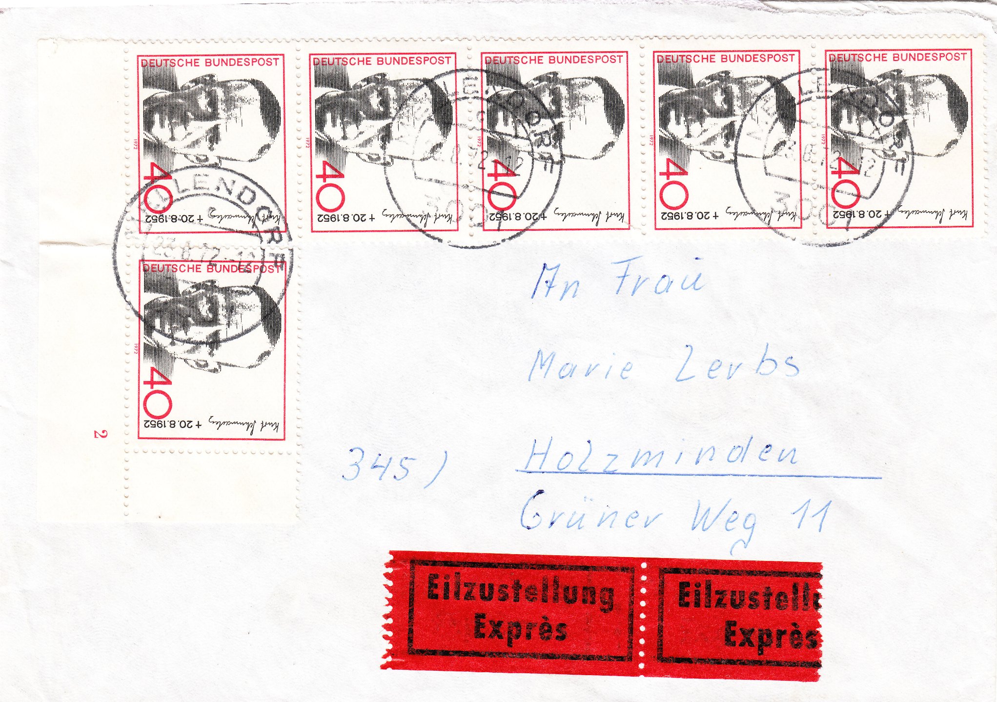 Am 18.08.1972 erschien aus Anlaß seines 20. Todestages eine Sondermarke, Bund MiNr. 738, hier als Mehrfachfrankatur gleich 6 Stück davon inklusive dem Eckrand 4 mit der Formnummer "2" am 23.08.1972 auf Fernbrief (40 Pfennig) per Eilzustellung (200 Pfennig):