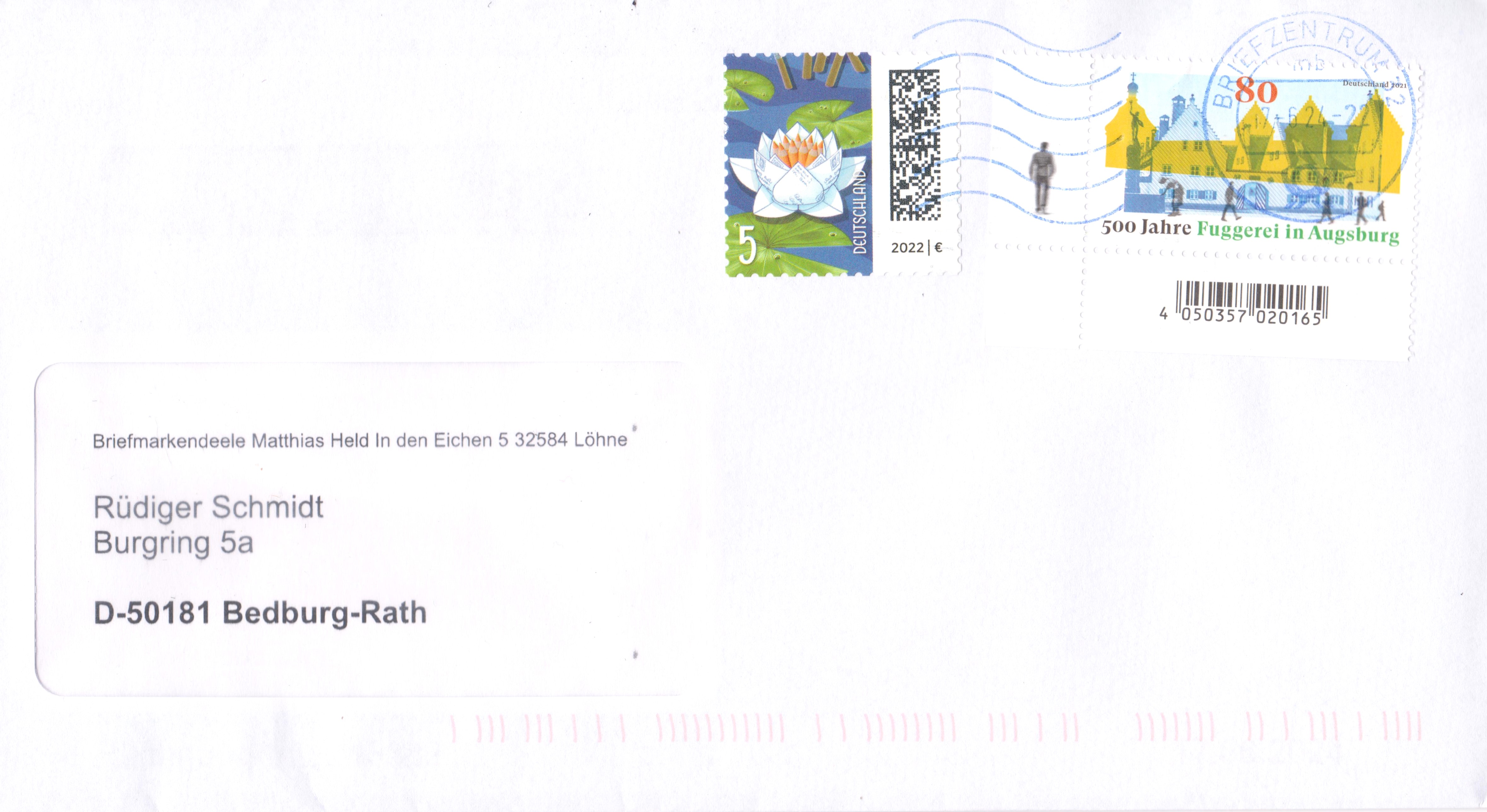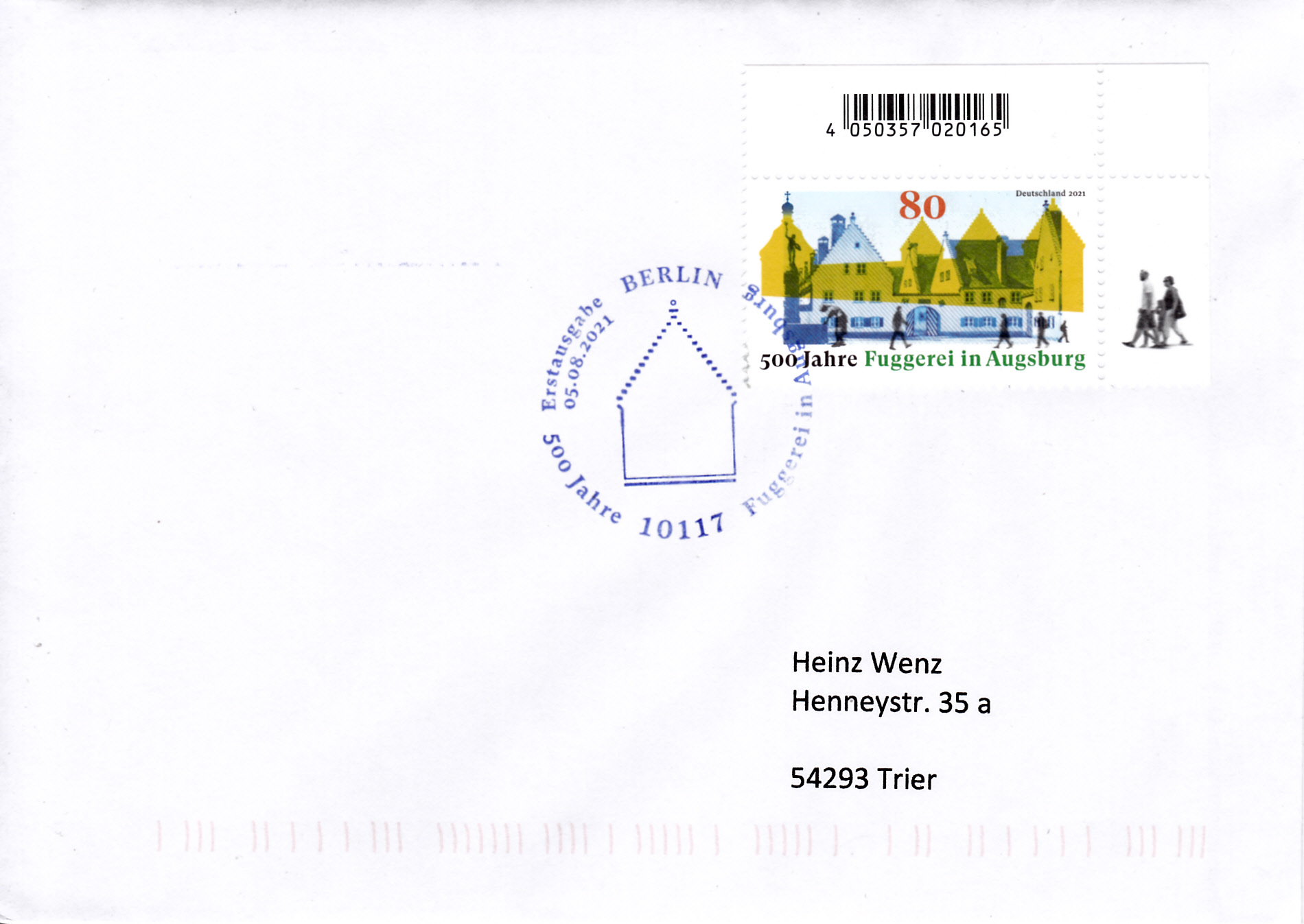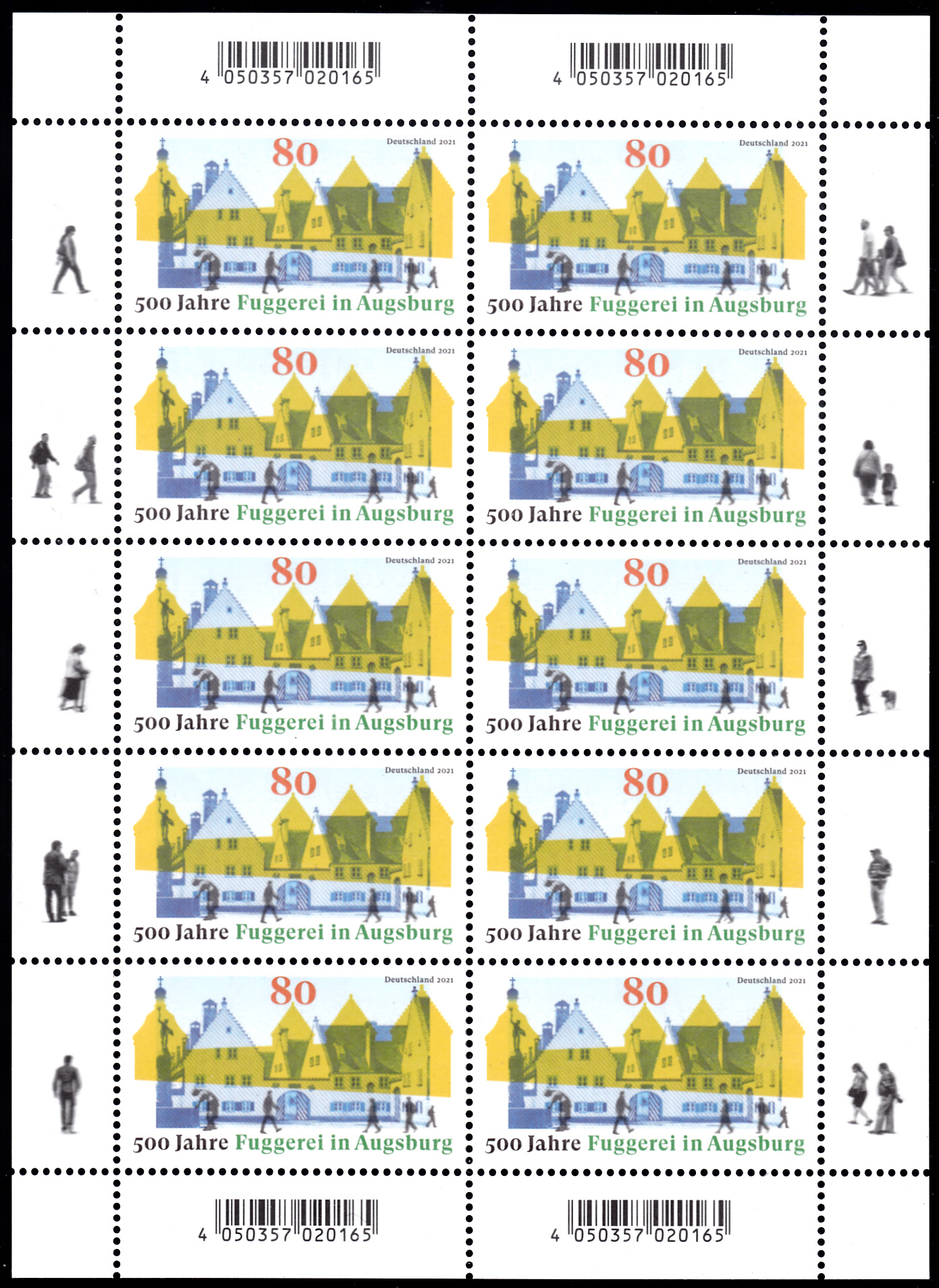 "500 Jahre Fuggerei in Augsburg" war für die Deutsche Post ein Anlass für eine Marke (MiNr 3621). Sie zeigt Gebäude der Fuggerei mit Frau am Brunnen und Passanten. Hier zeige ich ein Eckrandstück mit EAN-Codierung.