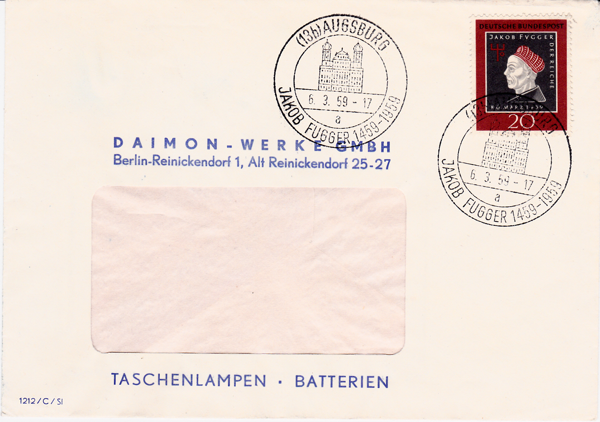 Hier folgt eine weitere Einzelfrankatur der Marke zum 500. Geburtstag von Jakob Fugger (MiNr 307) auf einem Fensterumschlag vom 6.3.1959, dem Ausgabetag der Marke, mit einem Sonderstempel aus Augsburg zur Markenausgabe.