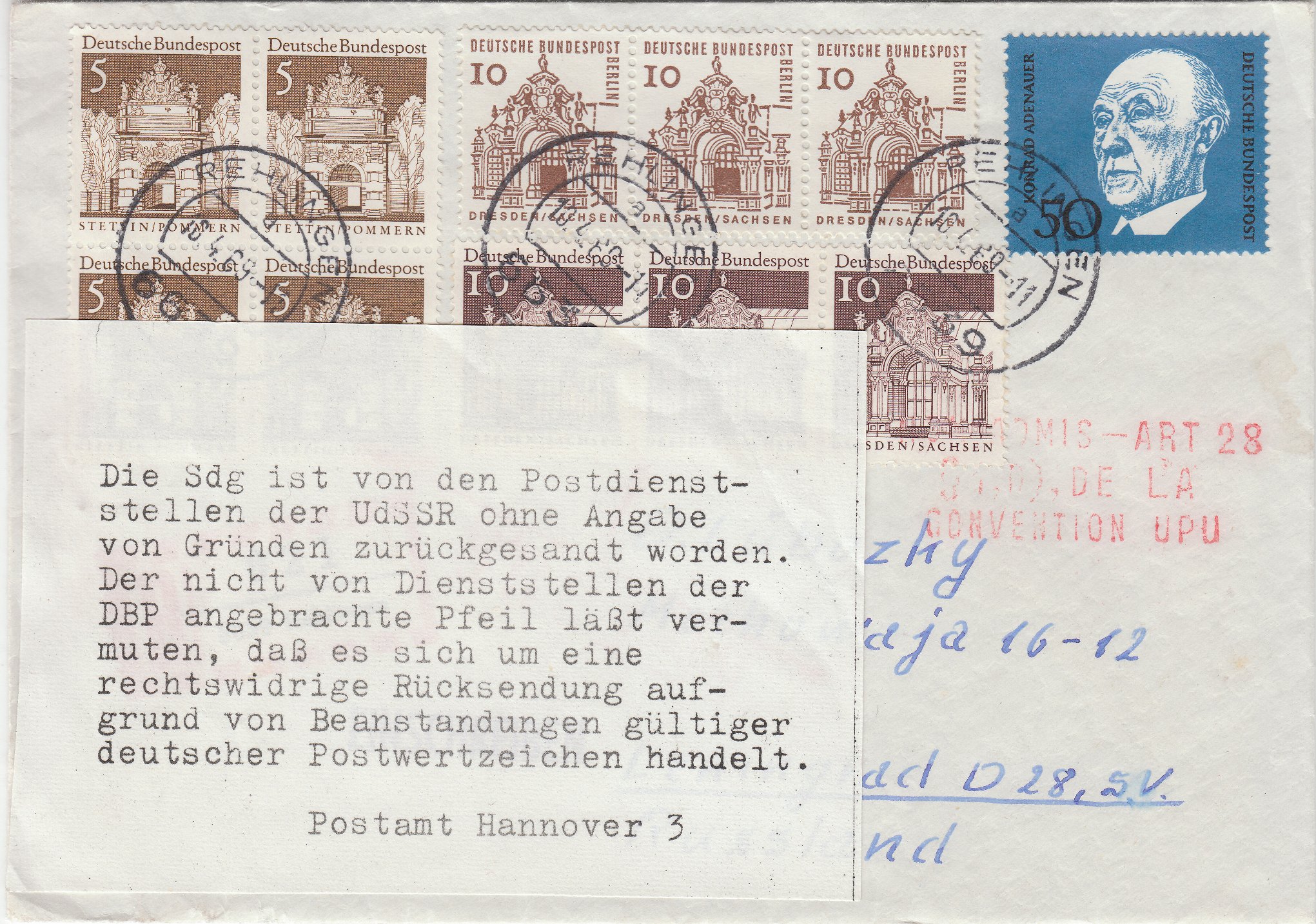 Ein Viererblock dieses Postwertzeichens wurde am 10.04.1969 als Teil der Mischfrankatur dieses Briefes nach Leningrad in der UdSSR verklebt. Die UdSSR leitete Sendungen mit diesem Postwertzeichen innerhalb der UdSSR nicht weiter und diese Sendungen wurden daher beim Postamt Hannover 3 mit einem Hinweiszettel versehen und gingen an den Absender zurück: