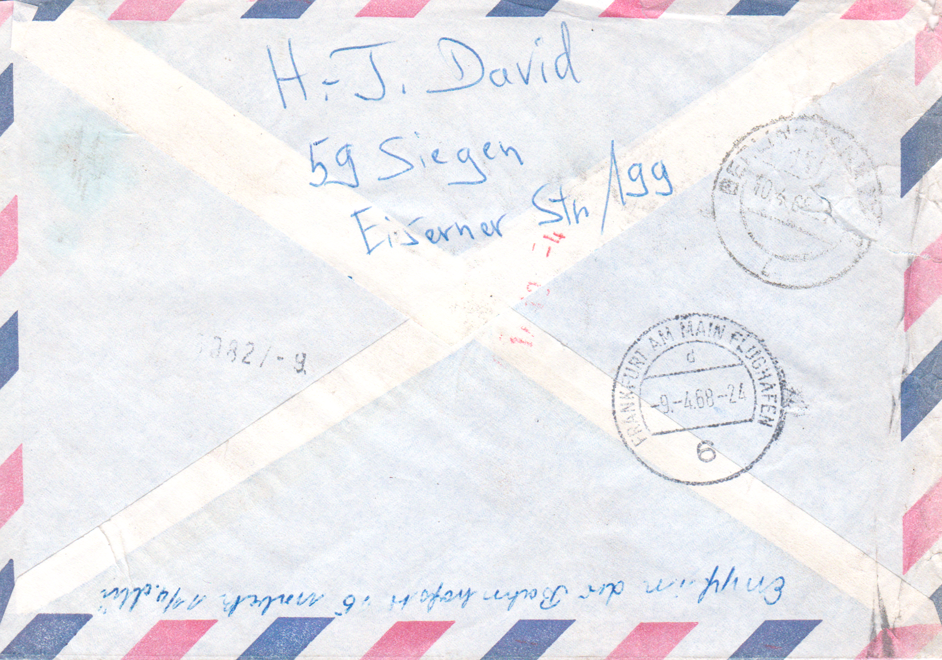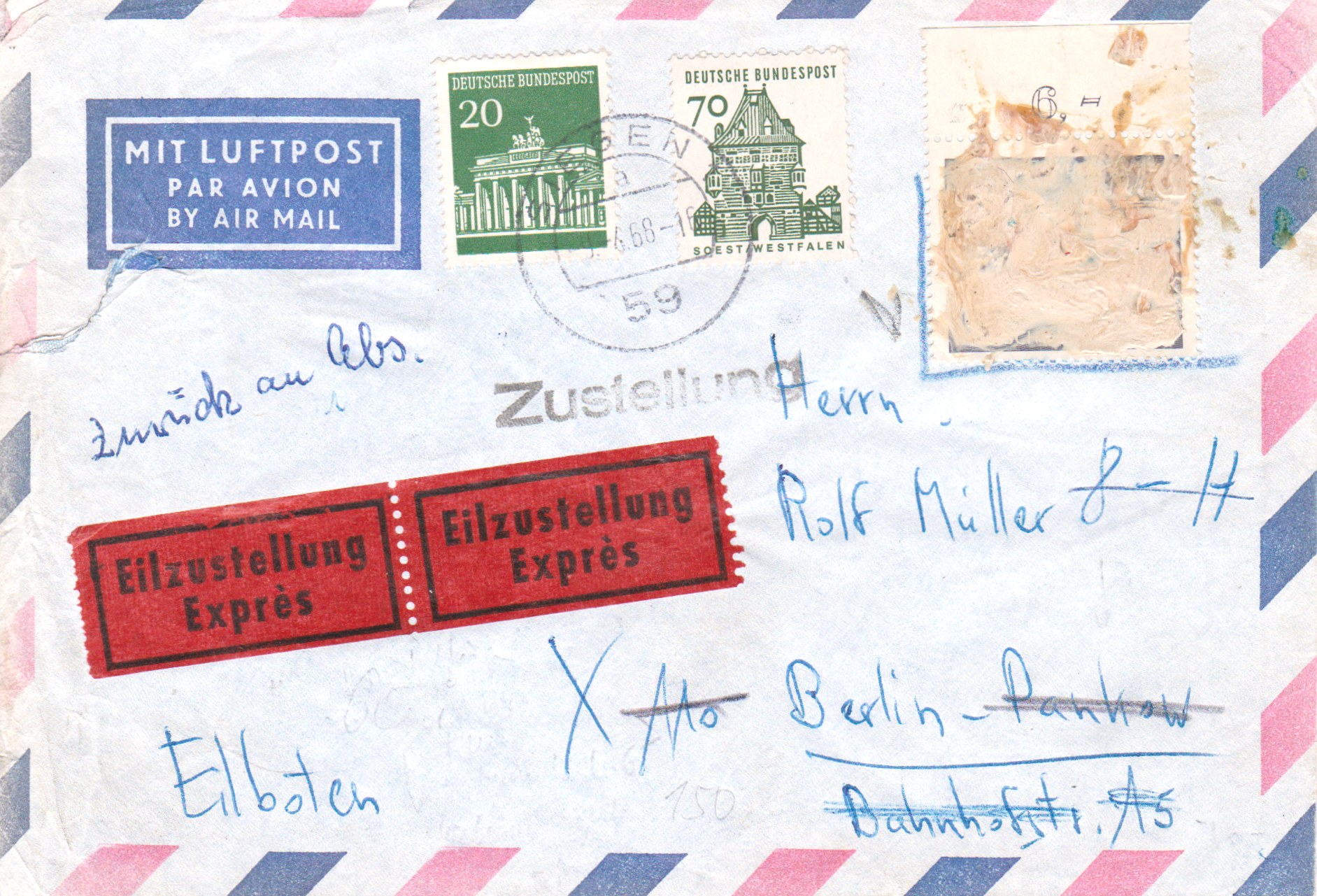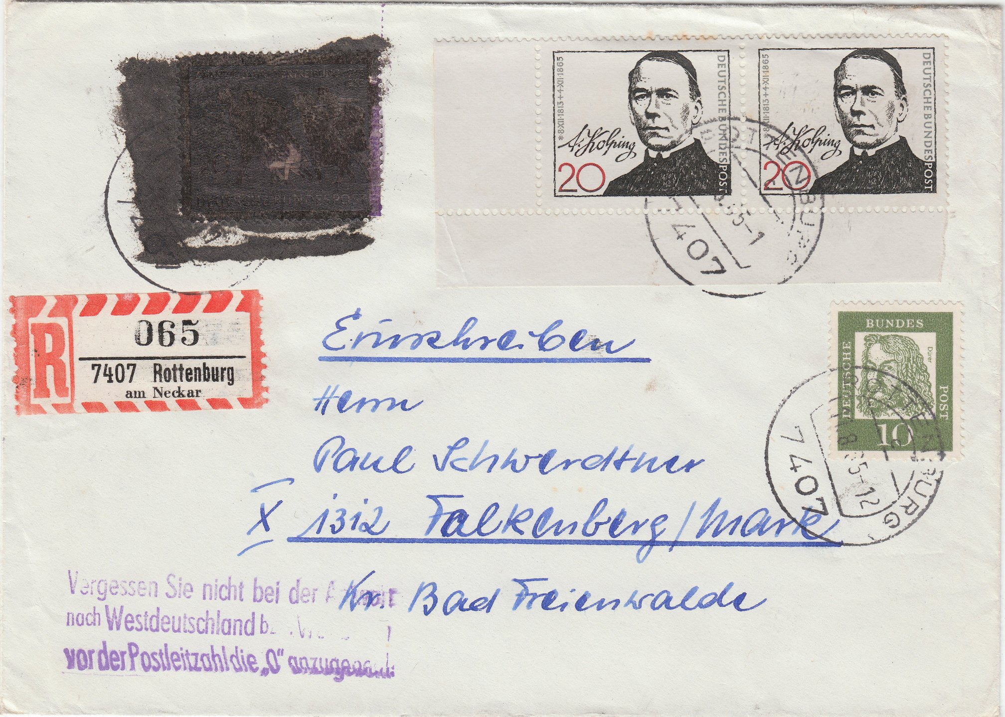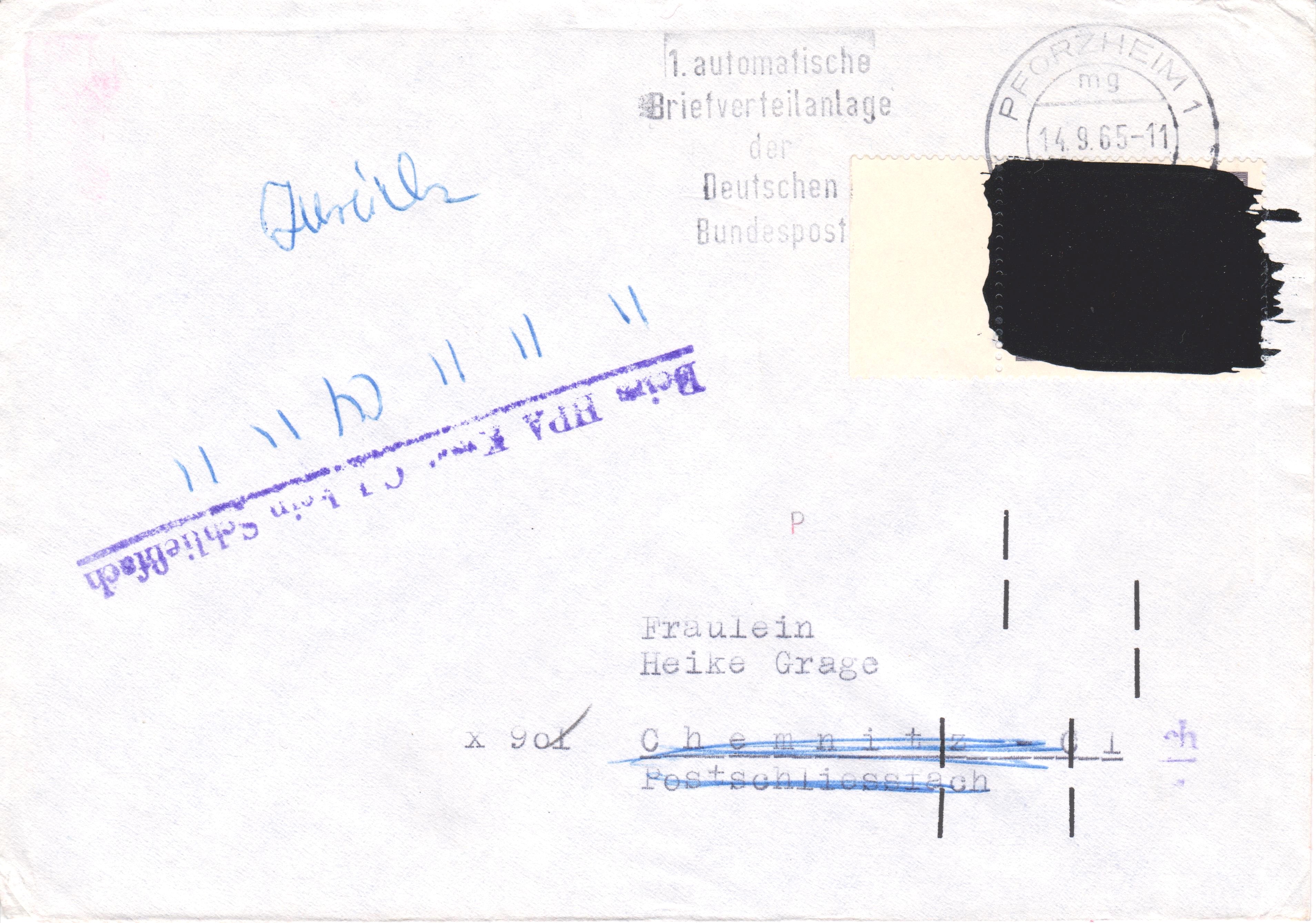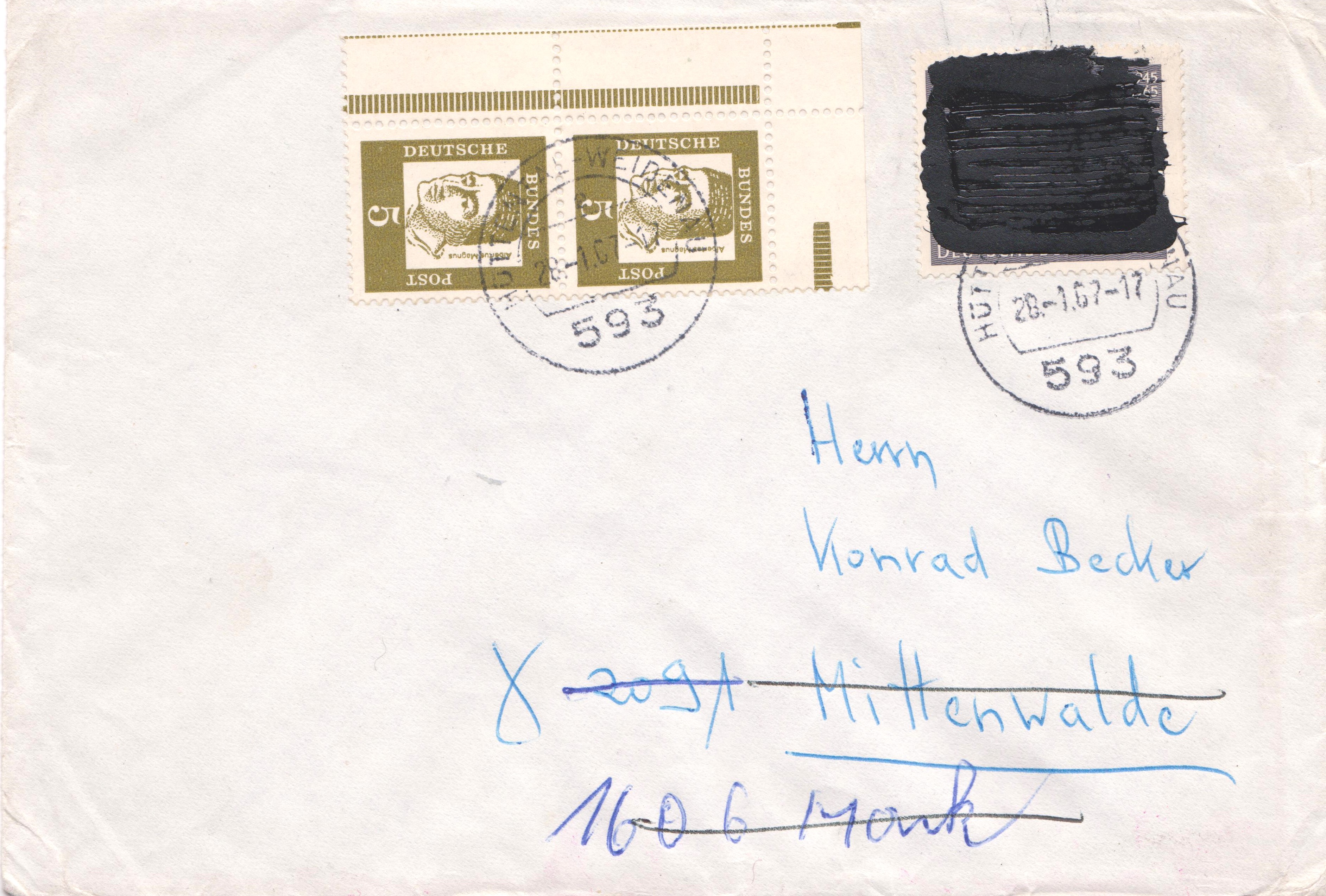 Auf diesem Brief per Einschreiben wurden am 6.9.1965 gleich drei Werte der MiNr 479 zur Frankatur benutzt und mit schwarzer Lackfarbe übermalt. Der Brief ist mit 10 Pf überfrankiert.