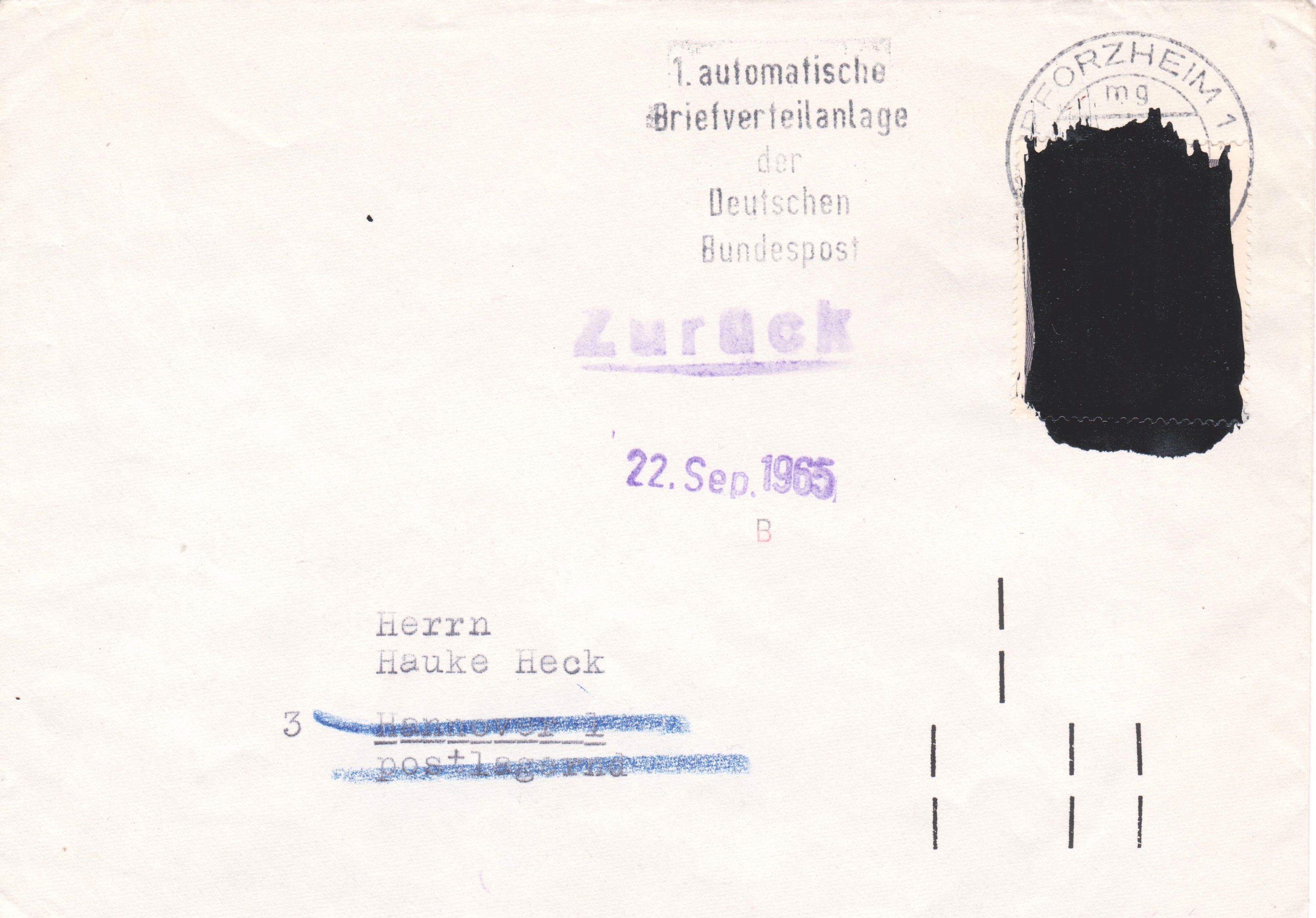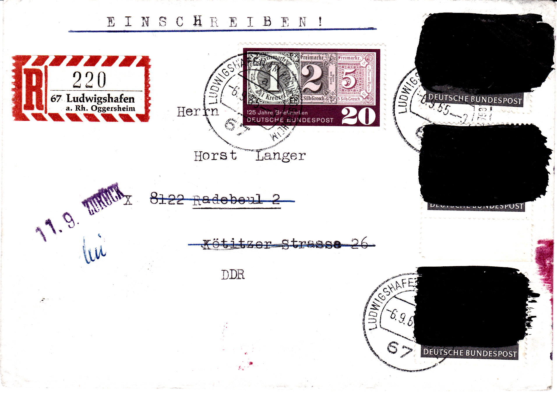 Bei diesem am 31.8.1965 per Einschreiben aufgegebenen Brief bis 20 g wurde die Marke MiNr 479 mit schwarzer Lackfarbe übermalt. Da in der angegebenen Anschrift kein Empfänger mit dem angegebenen Namen bekannt war, wurde der Brief zurückgeschickt.