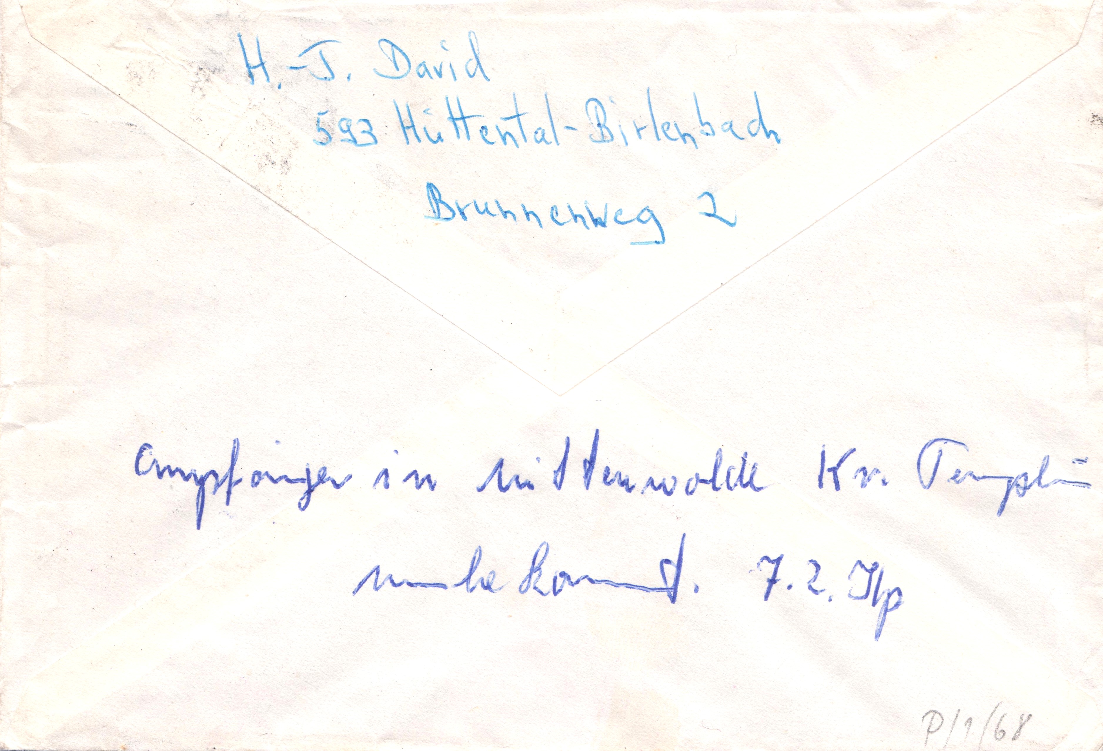 Interessant an diesem Bedarfsbeleg ist der von der Post angebrachte Hinweisstempel "Vergessen Sie nicht bei der Antwort nach Westdeutschland bzw. W-Berlin vor der Postleitzahl die "0" anzugeben".