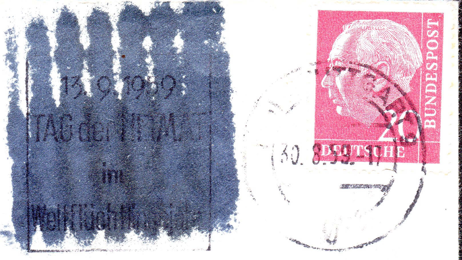 Nicht nur Postwertzeichern wurden beanstandet, auch unliebsame Stempelinschriften (hier: "Tag der Heimat im Weltflüchtlingsjahr" wurden übermalt.