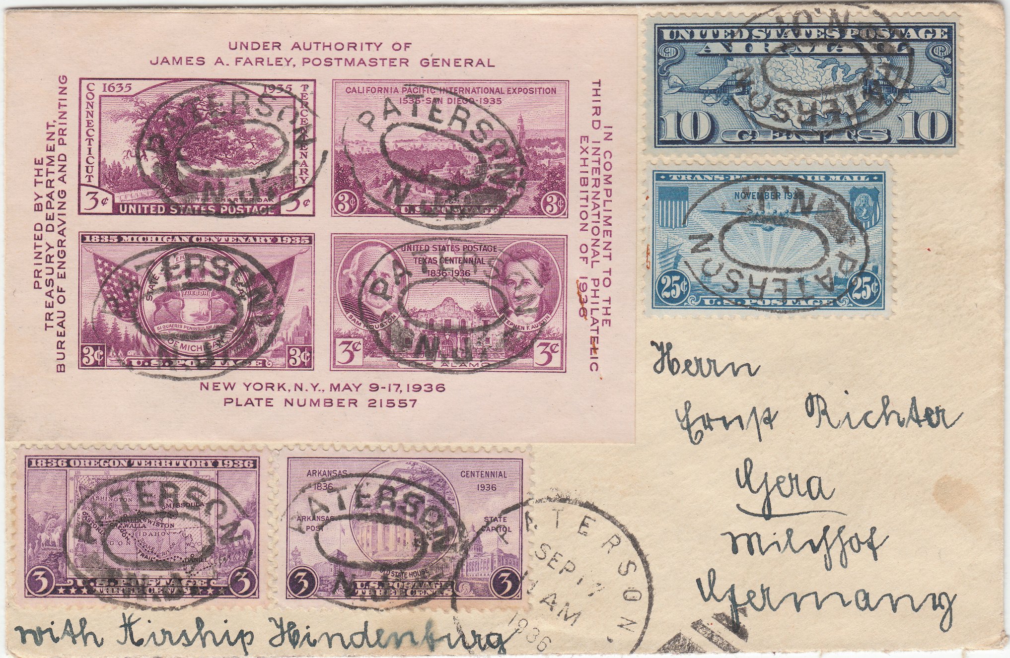 Dieser nach Gera adressierte Beleg wurde am 17.09.1936 in PATERSON, New Jersey, aufgegeben und lief als Zuleitungspost zur Rückfahrt der 8. Nordamerikafahrt von LZ-129 Hindenburg: