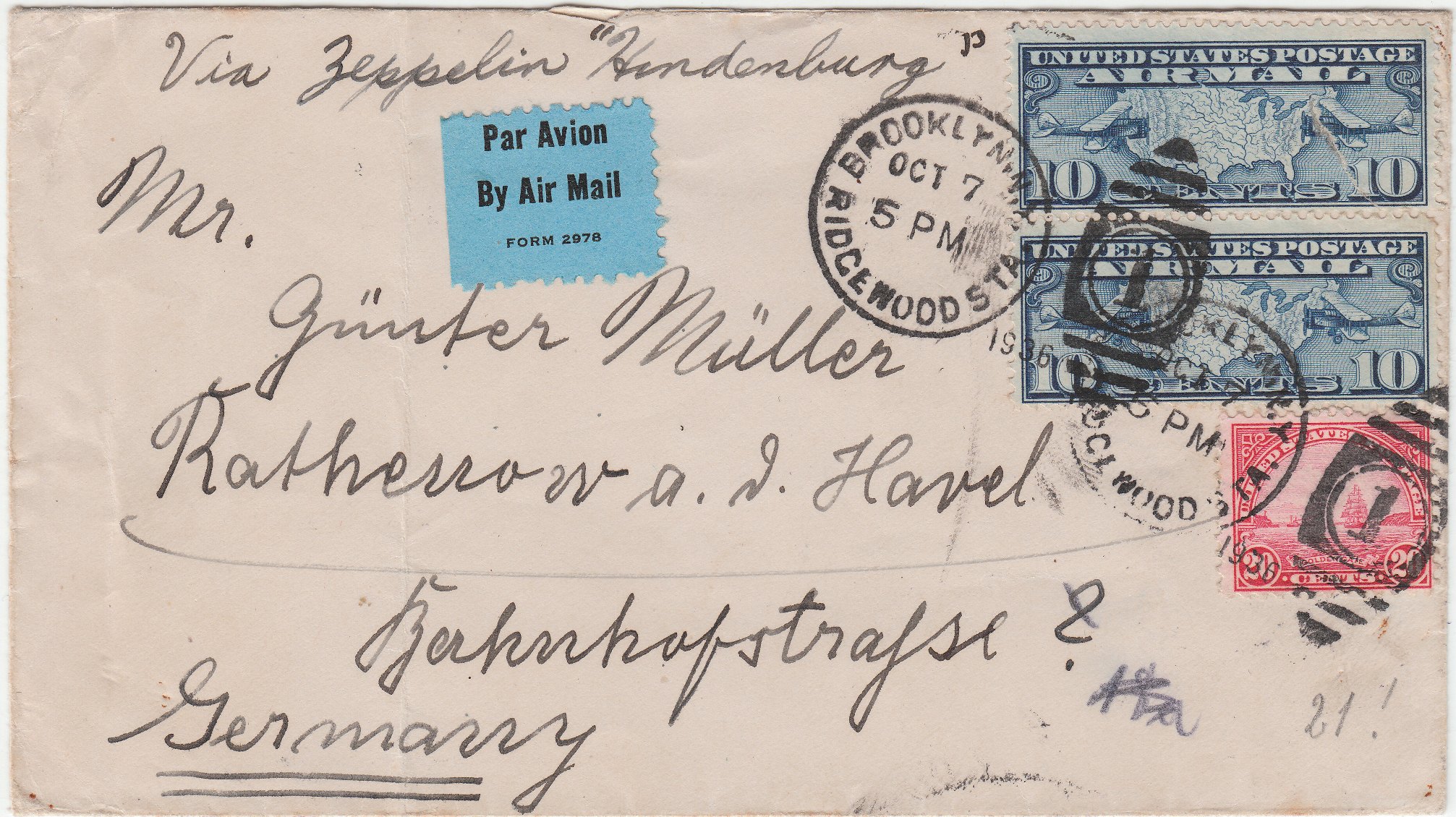 Dieser nach Rathenow an der Havel adressierte Beleg wurde am 07.10.1936 in Brooklyn, New York, aufgegeben:
