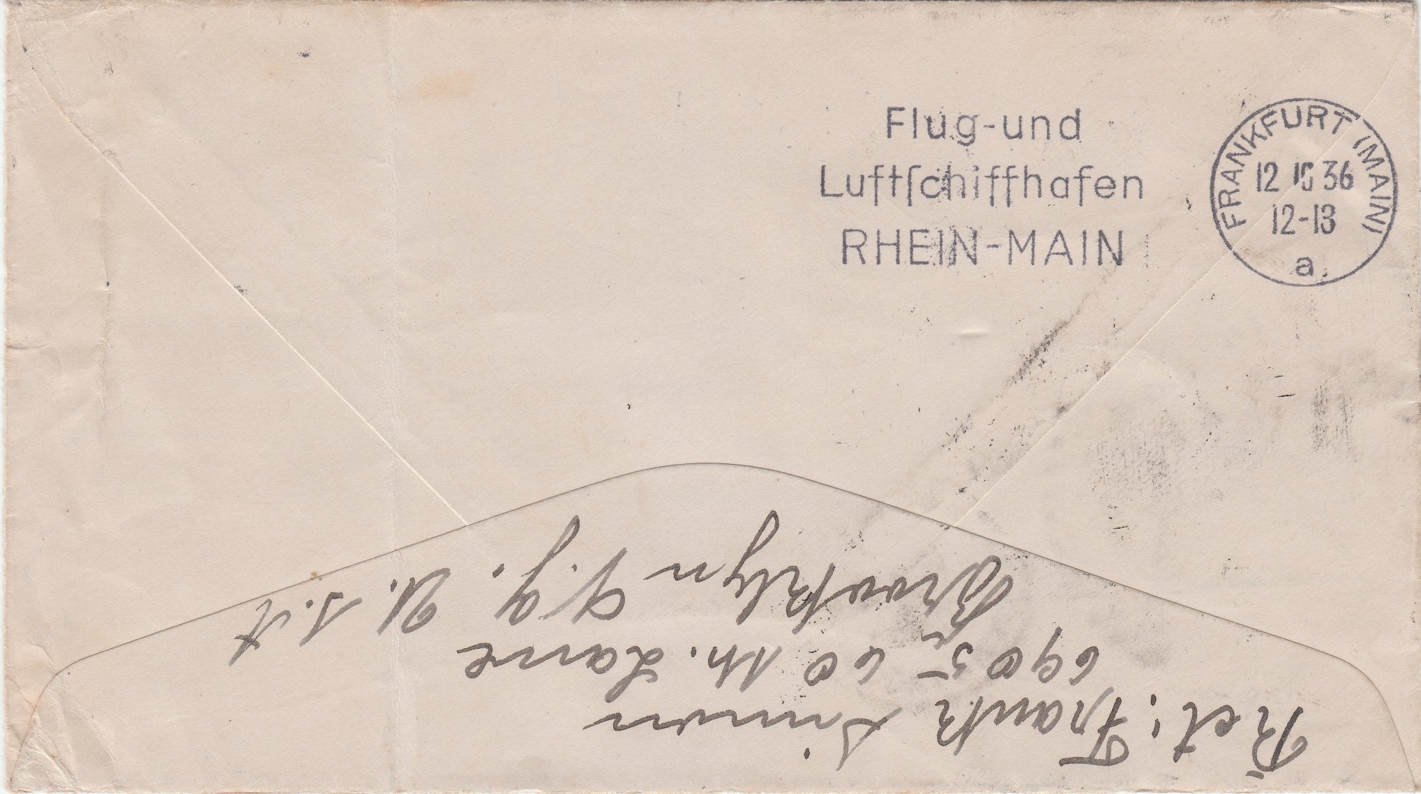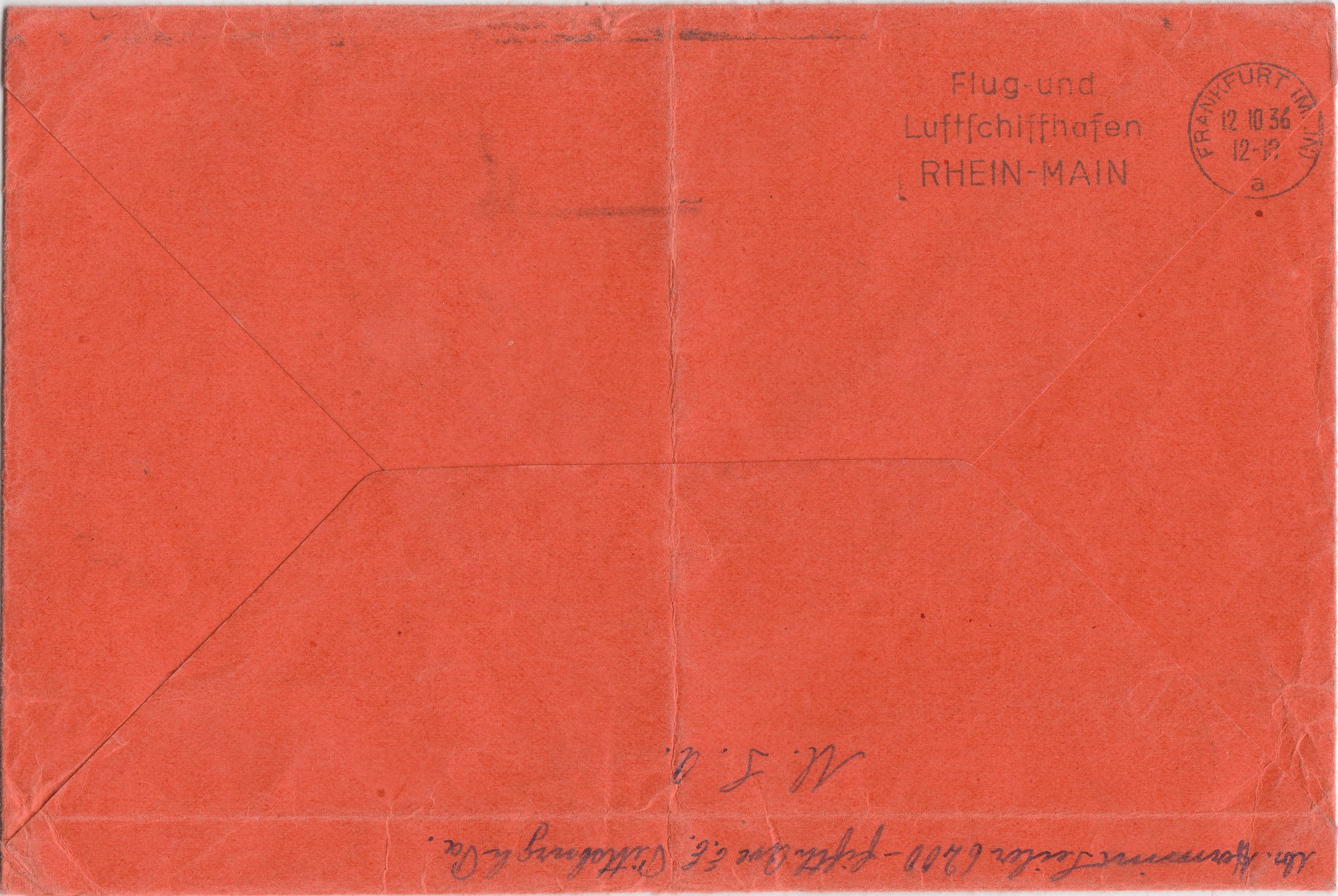 Durch den rückseitigen Abschlag des Maschinenstempels "Flug- und Luftschiffhafen RHEIN-MAIN" vom 12.10.1936 um 12-13 Uhr kann man diesen Beleg eindeutig als Zuleitungspost zur Rückfahrt bei der 10. Nordamerikafahrt des Luftschiffes LZ 129 HINDENBURG von Lakehurst nach Frankfurt zuordnen: