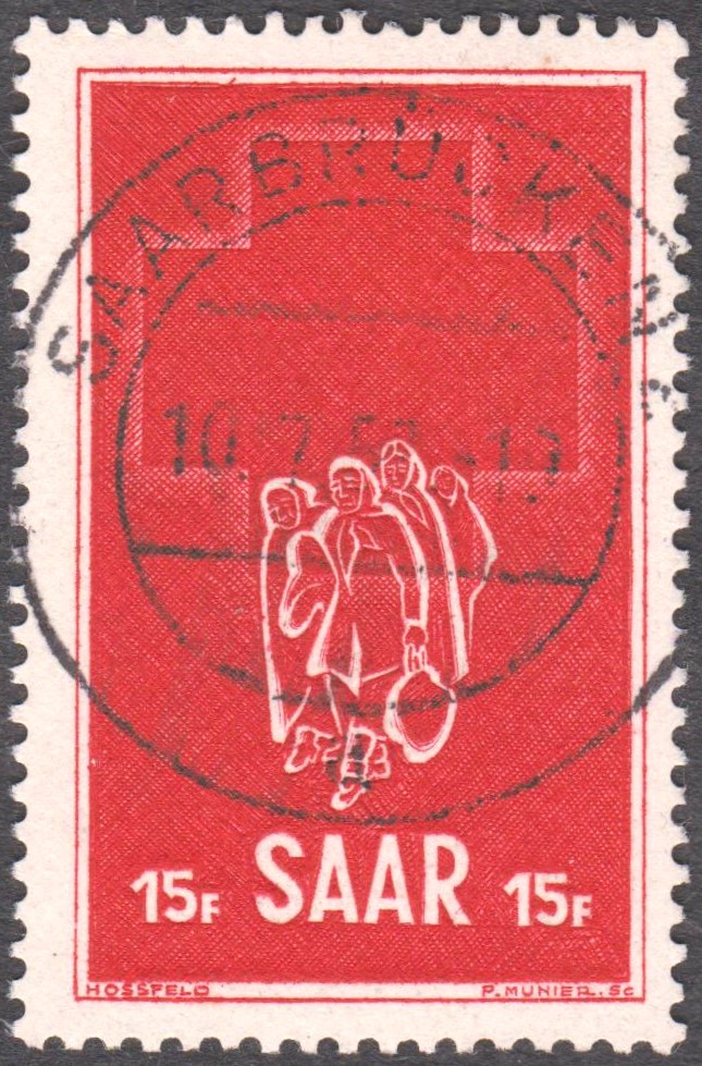 Saarland MiNr. 318 erschien am 02.05.1952 in einer Auflage von 1.500.000 Stück zur "Woche des Roten Kreuzes" und zeigt eine Flüchtlingsgruppe: